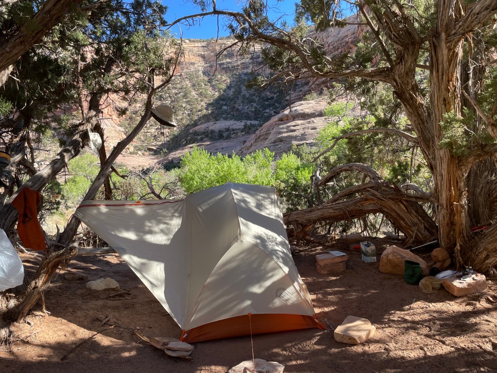 By the time we got to the campsites to unload all of our gear, we were completely out of water and were a little overheated. I sat down in the shade and Shannon went to try to find that puddle of water. When he re-appeared an hour later, with a full water bottle, I could have cried from relief. Until he said “well, it’s from a puddle. We’ll need to boil it. As I walked up to it a frog sort of slid into it, and it smells like rotten eggs” Um… excuse me? Turns out he wasn’t kidding. I’ll post a video he took of our only water source on instagram. We had our water filter, and iodine tablets, and the camp stove and a small can of propane. By this we were able to treat it all 3 ways. I am very happy to report that we survived, mostly un-scathed.