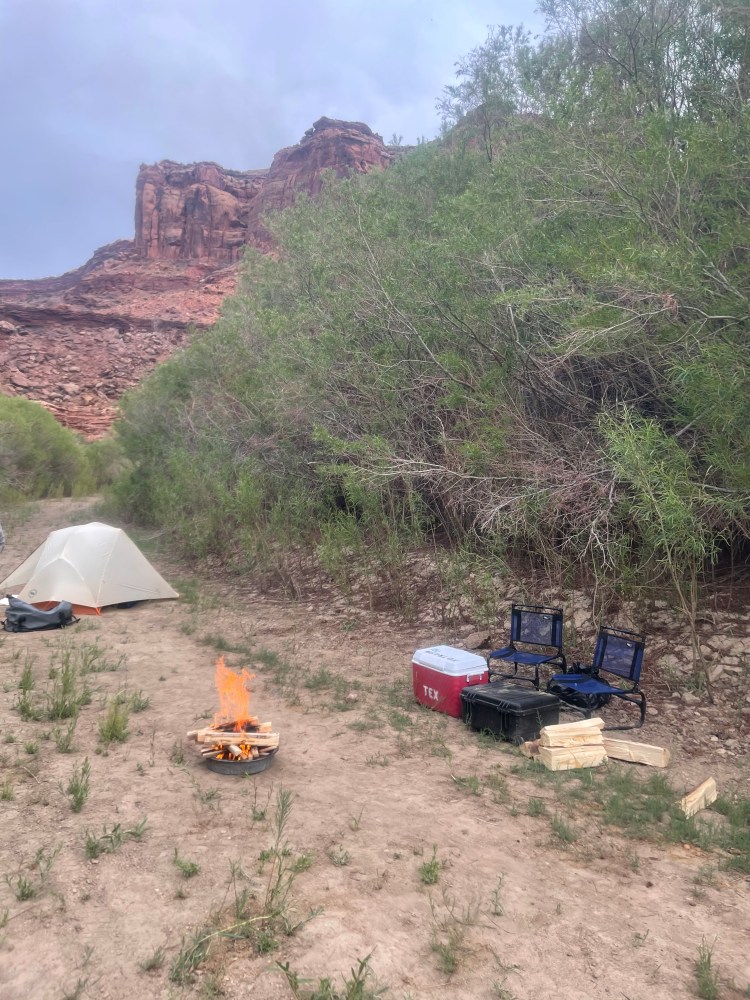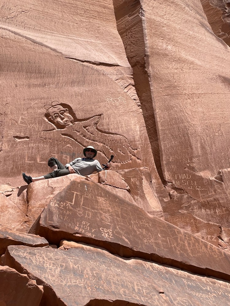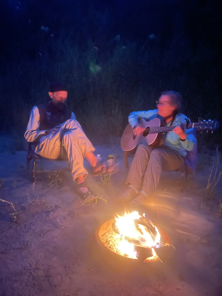 The one Julien inscription we did find was located in Hell Roaring canyon. ( I searched for information about why it’s called Hell Roaring canyon and came up empty.) It’s fun to sit around the campfire and think about all of the possible ways it may have gotten it’s name. Speaking of campfire, we had a fun one on our 3rd and final night of the float. As I mentioned in the previous post, we eventually met the owners of the other canoe we’d seen on our first day at 3 mile canyon. We crossed paths with them a few times throughout the float, and introduced ourselves, exchanging trip experiences. The 3rd or 4th time we ran into them, we started to become friends. They were John and Wendy from California and Oregon. On the last night of the trip, they ended up camping just down from us in Hell Roaring Canyon. We invited them to come and sit around our campfire, and John asked if either of us played guitar? He’d brought a river guitar along in a dry bag! As it happened, all 4 of us played guitar and sang enough to be able to entertain each other for a couple of wonderful hours.