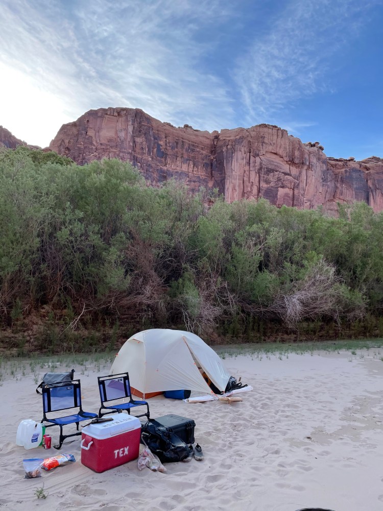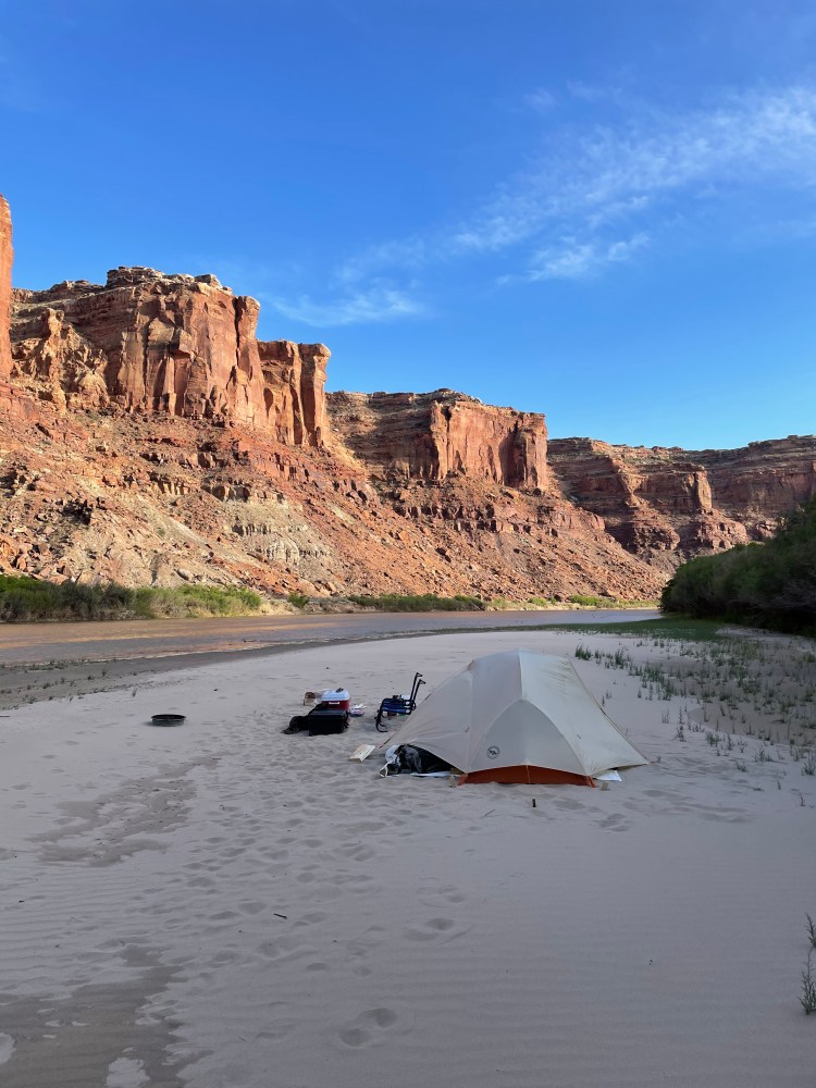 On the 2nd evening, the wind picked up again just as it had the day before. We had another couple of hours of struggling against wind and whitecaps following a full day of calm waters. We stopped on a sandbar just before the start of “ bowknot bend”. Shannon went to work securing the tent in the sand, as we expected the high winds in the wee hours of morning again. He used the sand to bury the tent about a foot deep all the way around. This time, we stayed completely sand-free all night long.