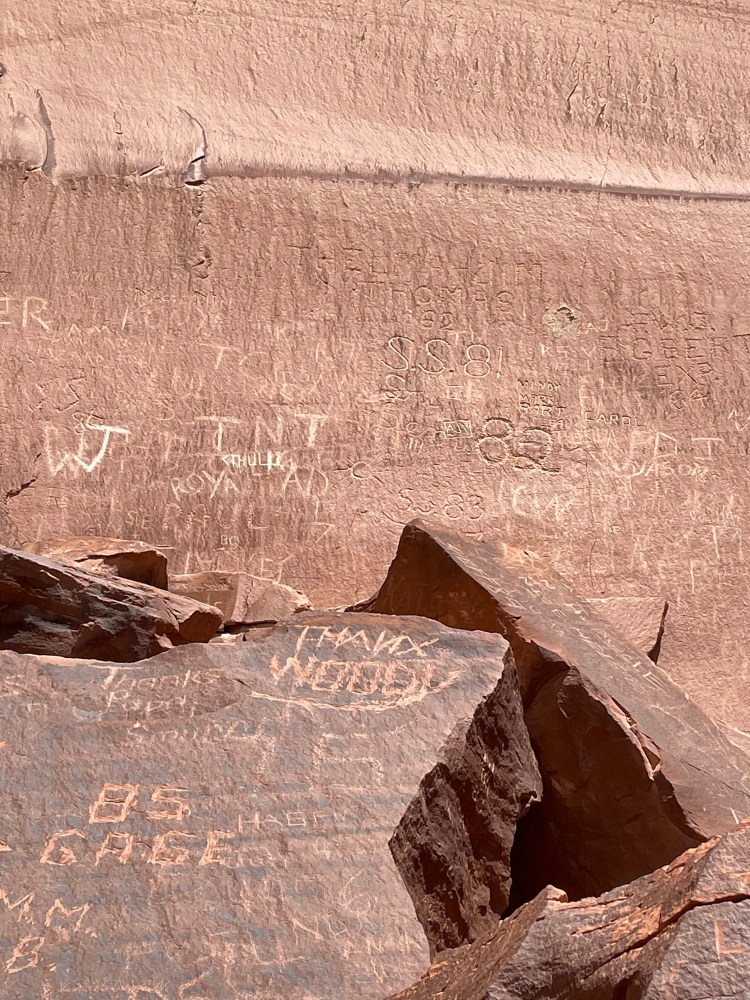 We had fun reading as many of the signatures and dates as we could take in. There are far too many to be able to read them all. Facing out from the River register to look back at the Green River, was one of my favorite views. Its hard to capture fully in panoramic in an iPhone photo, But I have the one below blown up and hanging in my office.