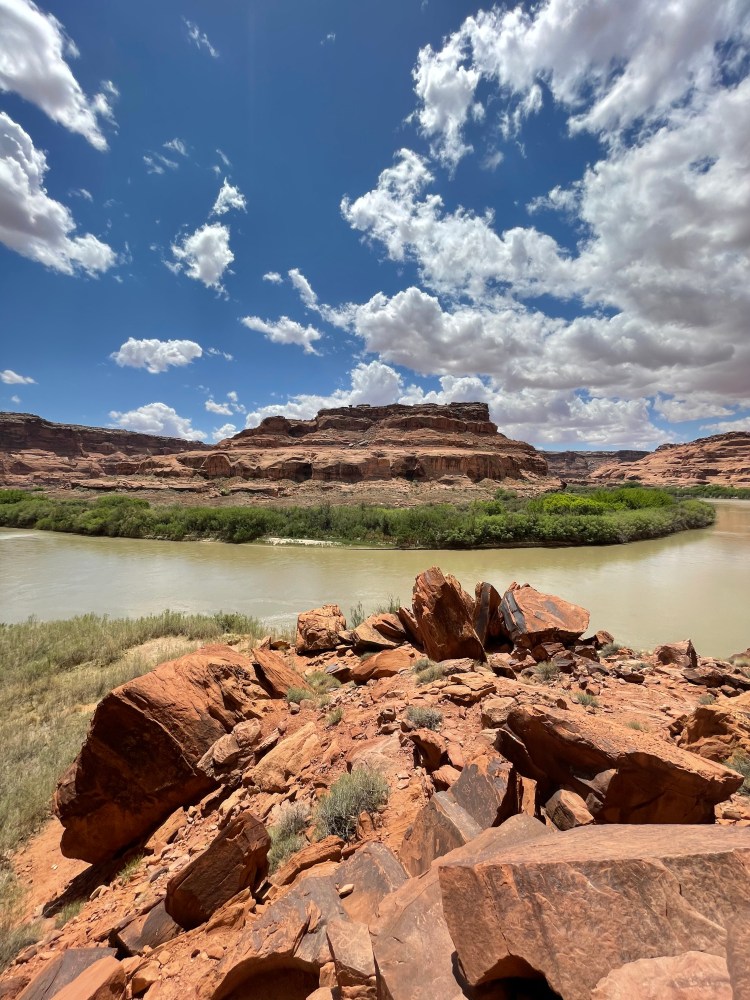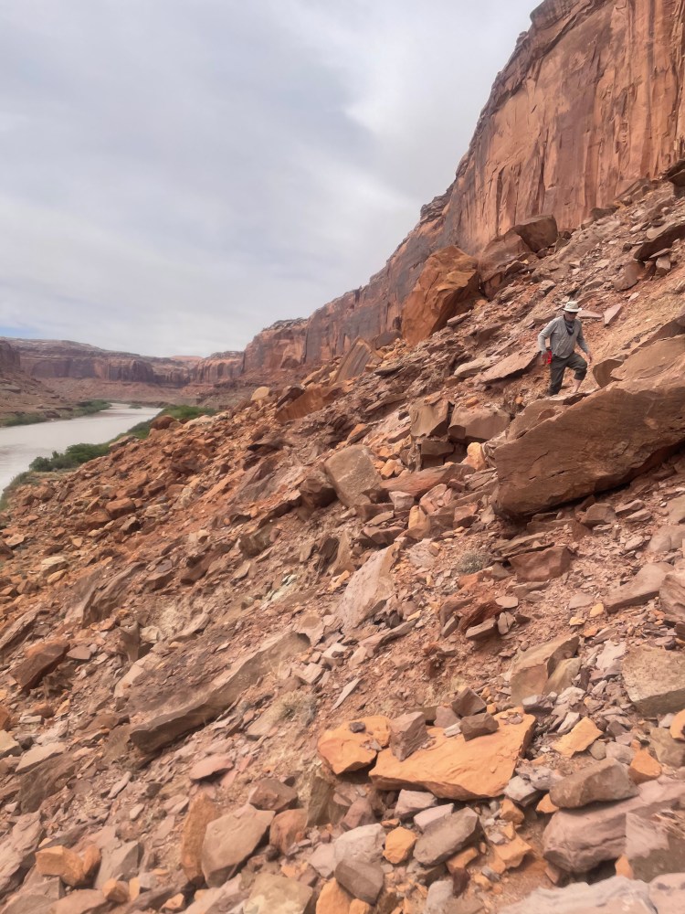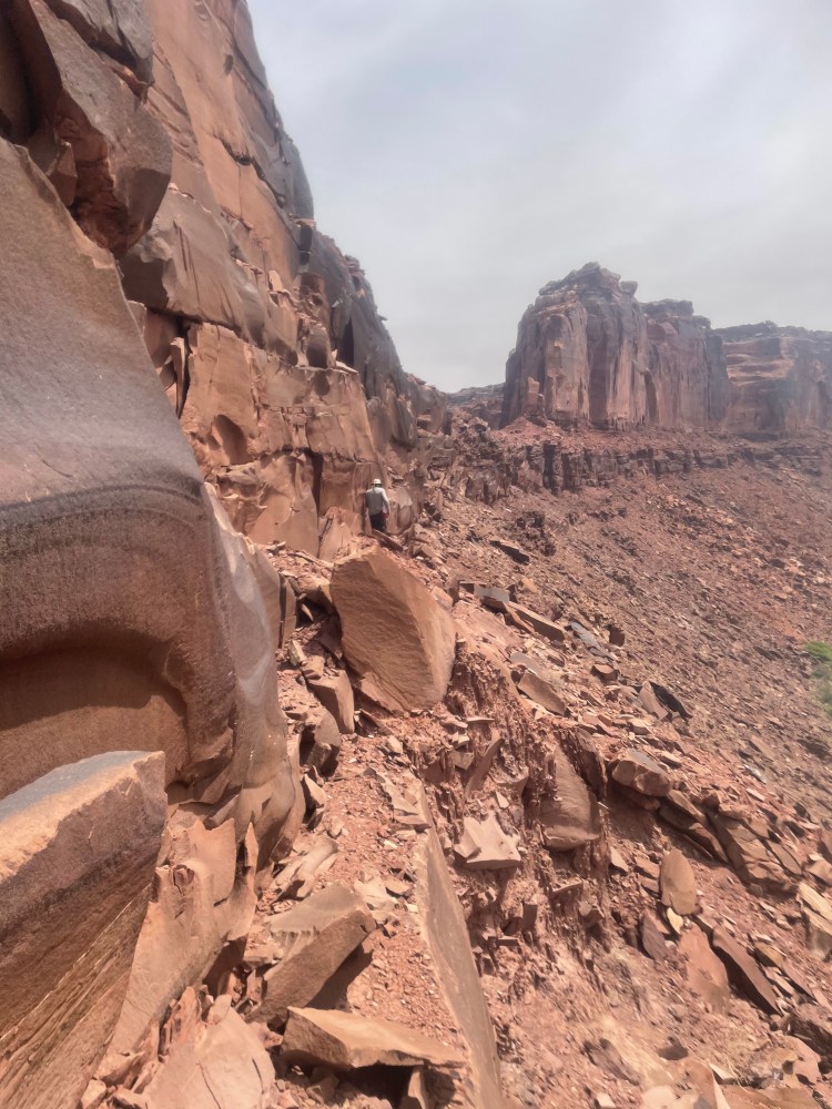 The morning of the 3rd day, we set out to see bowknot bend. There’s a well known photo op from the top of the saddle above bowknot bend, that we looked forward to reaching and exploring. We tied the canoes at a spot just past the saddle, that looked like something that resembled a trail. When we got out and started walking around, we realized that there was not a marked trail. There was also no clear path to the top of the saddle. We picked out a place that looked stable and started climbing. The steep angle of the climb and the size of the boulders on the side of the mountain, were impressive. We were climbing in our water shoes, which made it interesting.