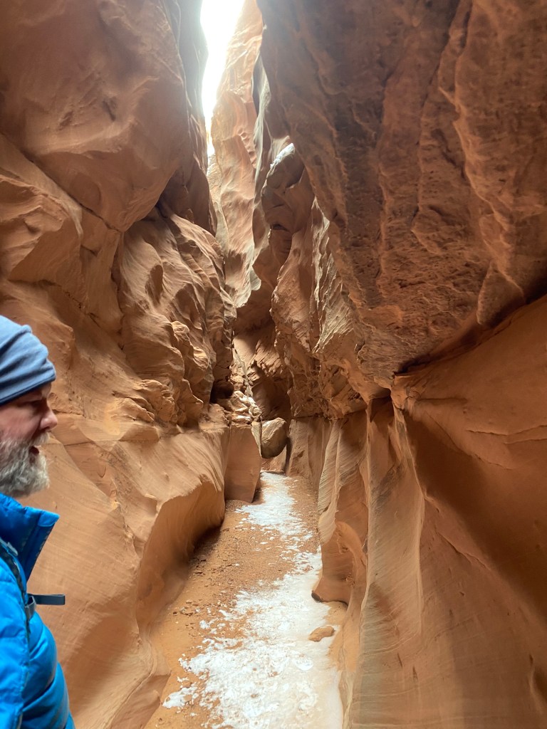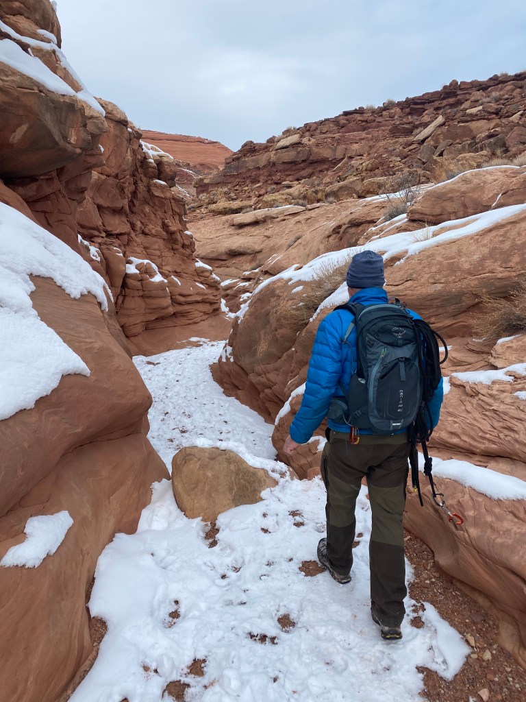 From the car to the start of the wash took about an hour, and by the time we reached the mouth of it, we started to get really excited. We’d brought boot spikes in case of ice covered rocks and frozen standing water but didn’t use them as it was fairly dry with minimal snow cover inside the wash.