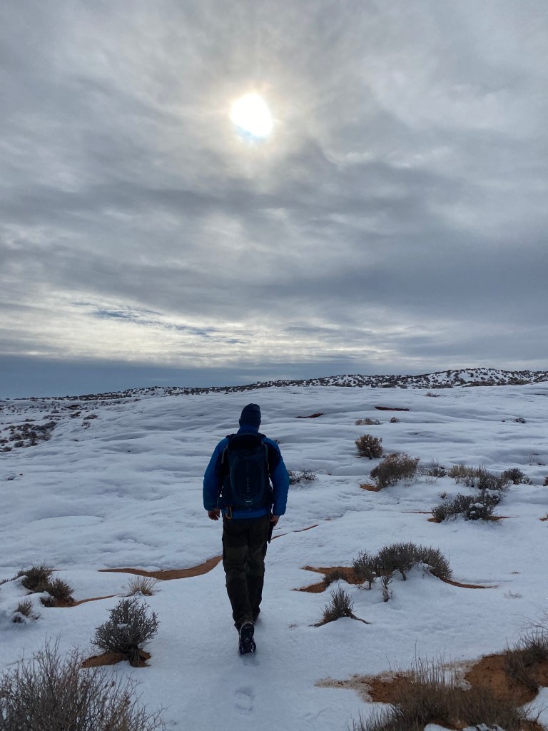 Once we got to the top, we began looking for trails. We had a general idea of direction, thanks to the GPS, and we could see the top of the wash we’d just walked in. Very important to stay far enough away from the rim of the canyon to not risk falling in. We walked for a good while without a trail, although there were a couple of visible cairns out in the open. I found some of the best bright red and yellow agate in the rocks as we stopped to look through them on some breaks. The snow and the prairie and the sky came together out here in an arresting display. We did eventually re-join the trail out, and realized that we’d come back to the trailhead that we’d missed on the way in. Although covered in snow and easy to have missed, we recognized the rocks lining the parking lot perimeter, which were barely sticking up out of the snow. There are no signs or trail markers here.