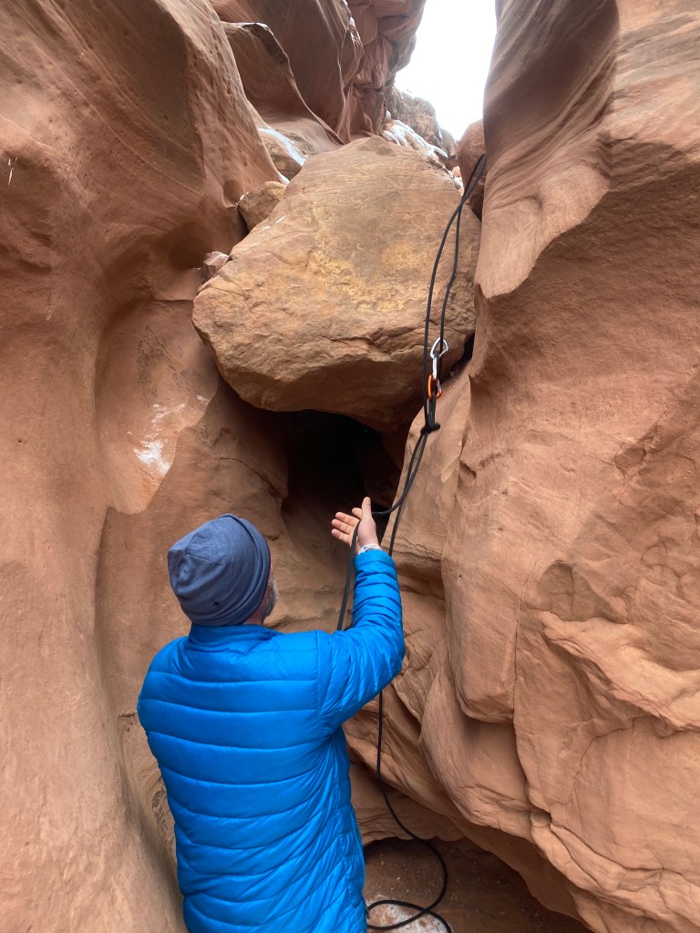 There was only one spot inside the wash that was tall enough that we needed to use a rope and carabeener to climb down. There were a few spots to scramble over and around large boulders but the actual 2 miles we spent down in the wash was not difficult. We’d read that there were several ways to get out of it; one was to continue on into a 2nd part of the wash that had a considerable distance (4-5 miles not in a loop) that we weren’t sure was wise in the conditions we were In. A 2nd option was to turn around and go back the way we came, which would have involved some skilled climbing up the steep rocks we’d just climbed down. The 3rd option, which was the one we chose, was to scale a steep rock wall up and out of the canyon at a mid way point between the 2 canyon washes.