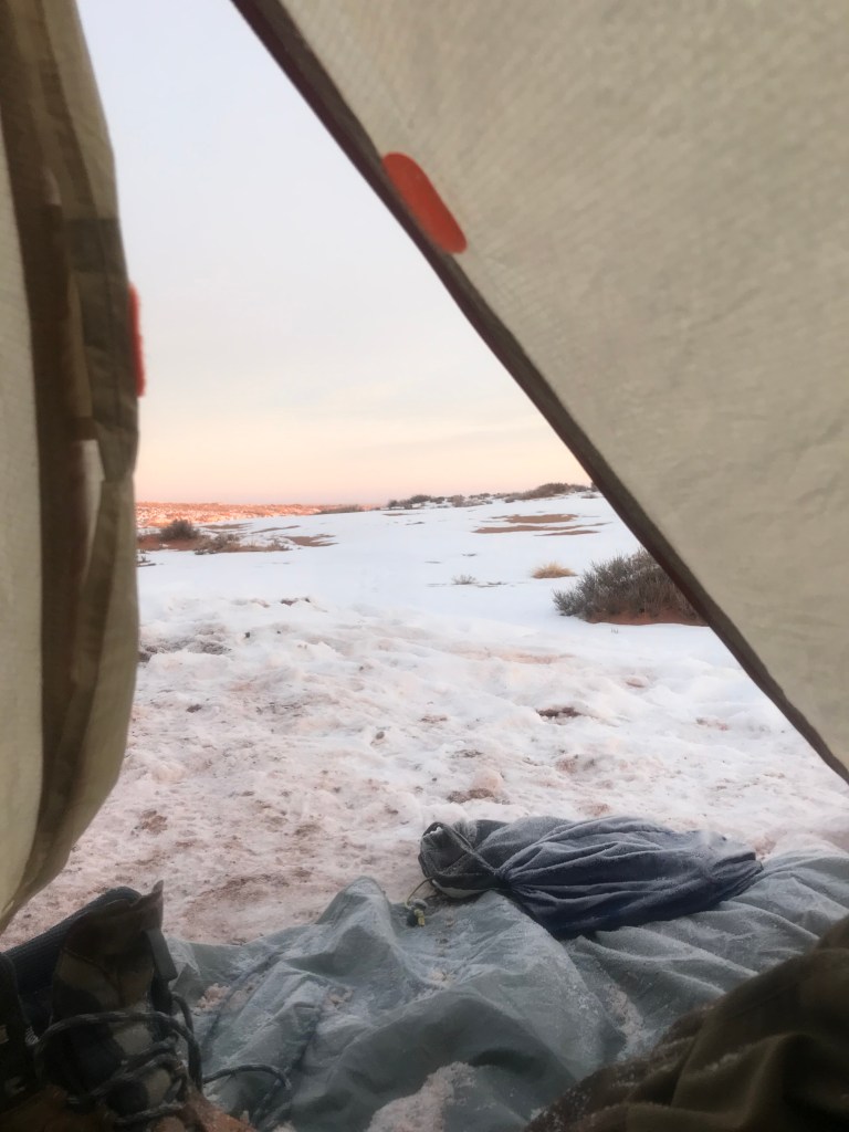 Waking up in a toasty warm sleeping bag, and knowing that you have to get out of it into 10 degree weather takes some serious motivation. It helped that we had a remote start on our vehicle which was about 50 feet away (putting on icy boots and getting from tent to car was not our favorite thing). It was motivation enough to know we were going to Moonshine Wash, which was promising in terms of scenery and adventure.