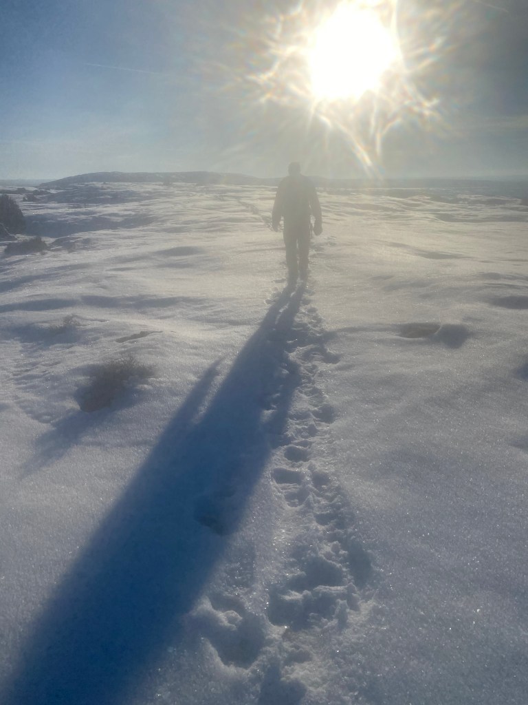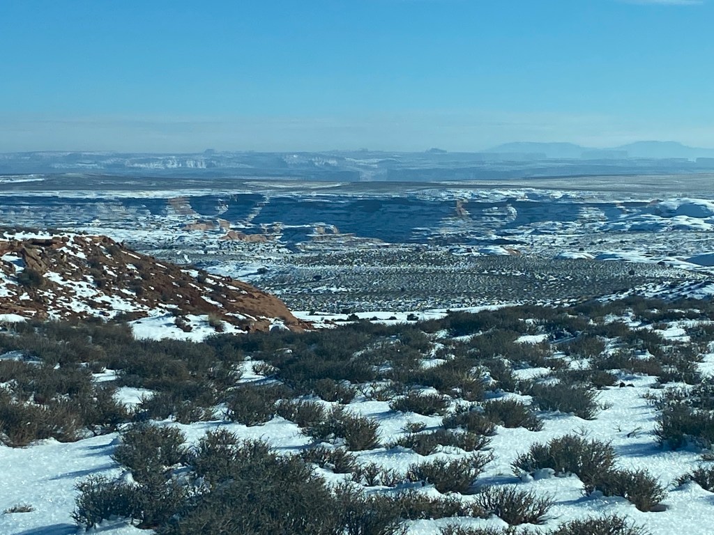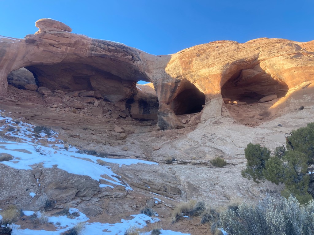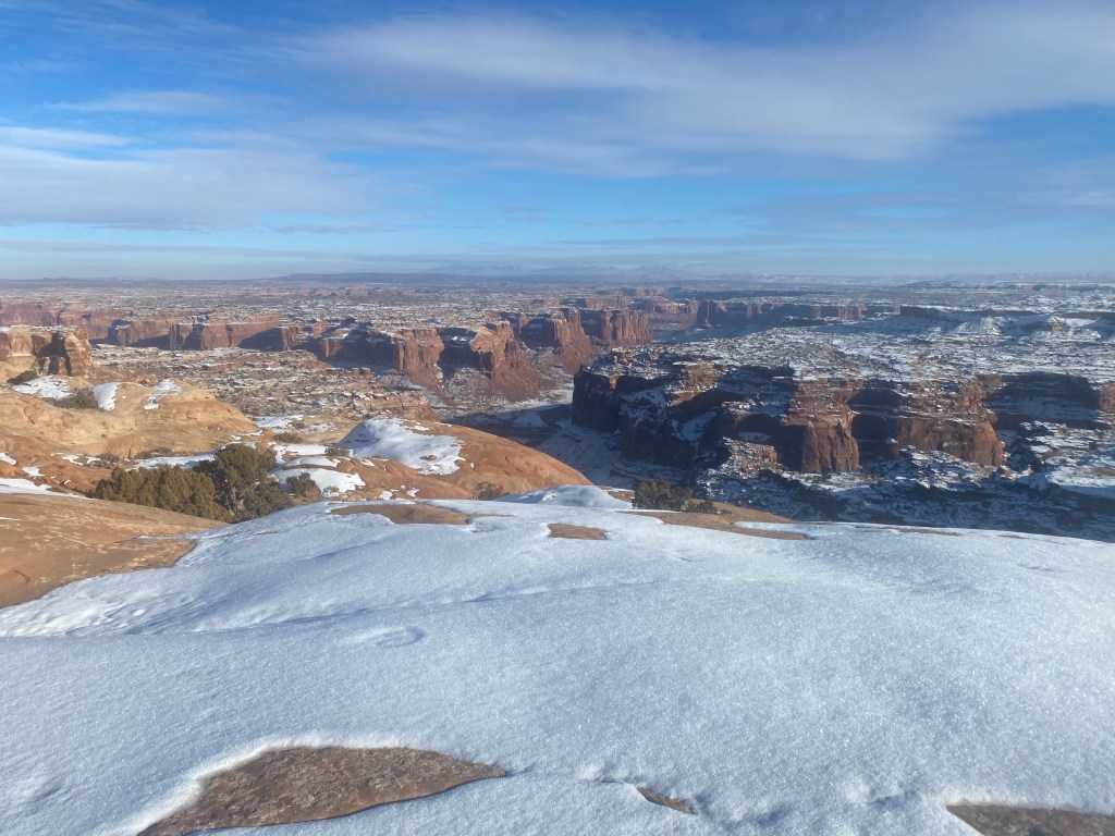 The next morning we woke to this incredible sunrise. Impossible to capture in panoramic with an iPhone camera, it encircled our campsite, bathing the snow in bright orange. A nice backdrop to end our stay here, as we packed up and headed to Horseshoe Canyon. I’ll tell you about that next!