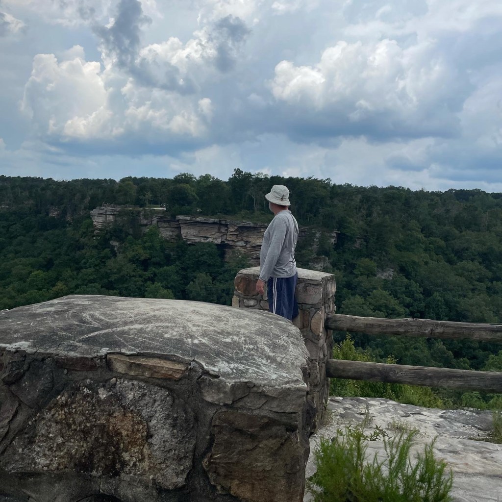 Just as we started back towards the trailhead, the storm clouds arrived. This is not at all unusual for this time of year in Alabama. These intense, bursts of rain and thunder come in like a beast. We got to enjoy about 45 minutes of a downpour that did not let up in intensity, while we sat in the humid truck, with an inpatient puppy. Thank goodness we’d also stopped to fill the cooler with beer and ice. Shannon pulled into one of the overlook parking lots while we waited for the rain to let up and the view was incredible.