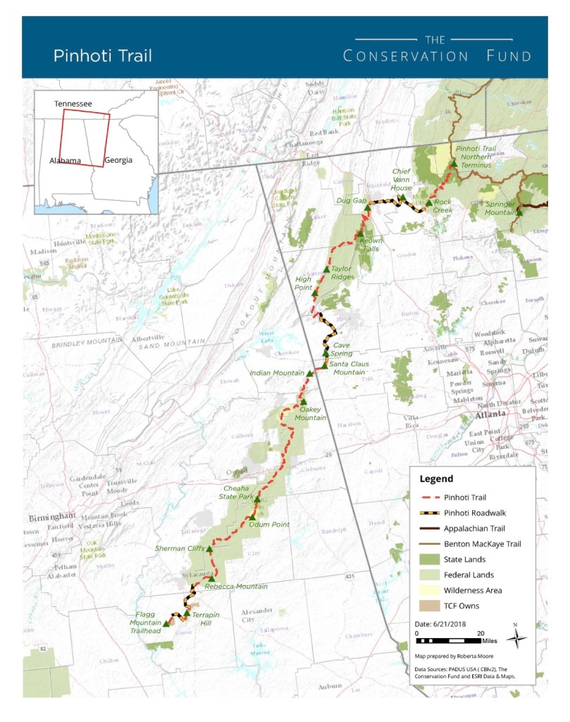 This beautiful trail meanders through the Southern Appalachian Mountains. It is part of the Eastern Continental Trail and the Great Eastern Trail. As of about 1985, the Alabama Trail association worked in tandem with the Conservation fund to link the Pinhoti with the Appalachian trail. There is an ongoing effort by AL and GA hiking groups to convince the US Congress to make it part of the AT.