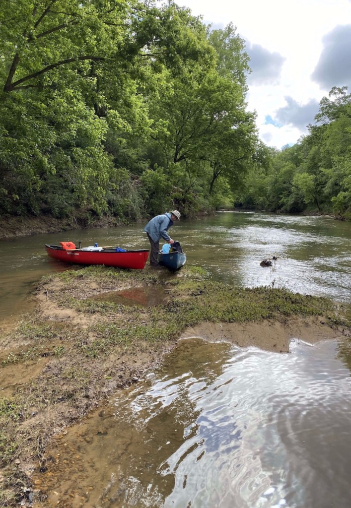 There is not a great put-in spot behind my townhouse. But we were determined to do it. The access to the Cahaba river is about a 1/2 mile hike from the cul-de-sac at the end of my street, down the gas line right-of-way road that is blocked for vehicles. It’s a very nice walk, shown to me by my neighbor Louise, as a perfect dog walking trek. It is that, but as it isn’t the least bit flat, with several steep inclines, it’s not meant to haul canoes. We drove around for a good part of the afternoon seeking a canoe put-in that was accessible enough to be reasonable. We (and by we I mean Shannon) ended up lowering both boats down a steep hill by rope, behind some apartments. Shannon tied the boats together and floated them about a mile to the spot at the end of my gas company road/ path where we’d embark the following morning. We’d already searched out the spot to tie the boats overnight. It was un-inhabited by civilization, and involved 3-4 foot deep mucky sand that sunk us up to our shins.