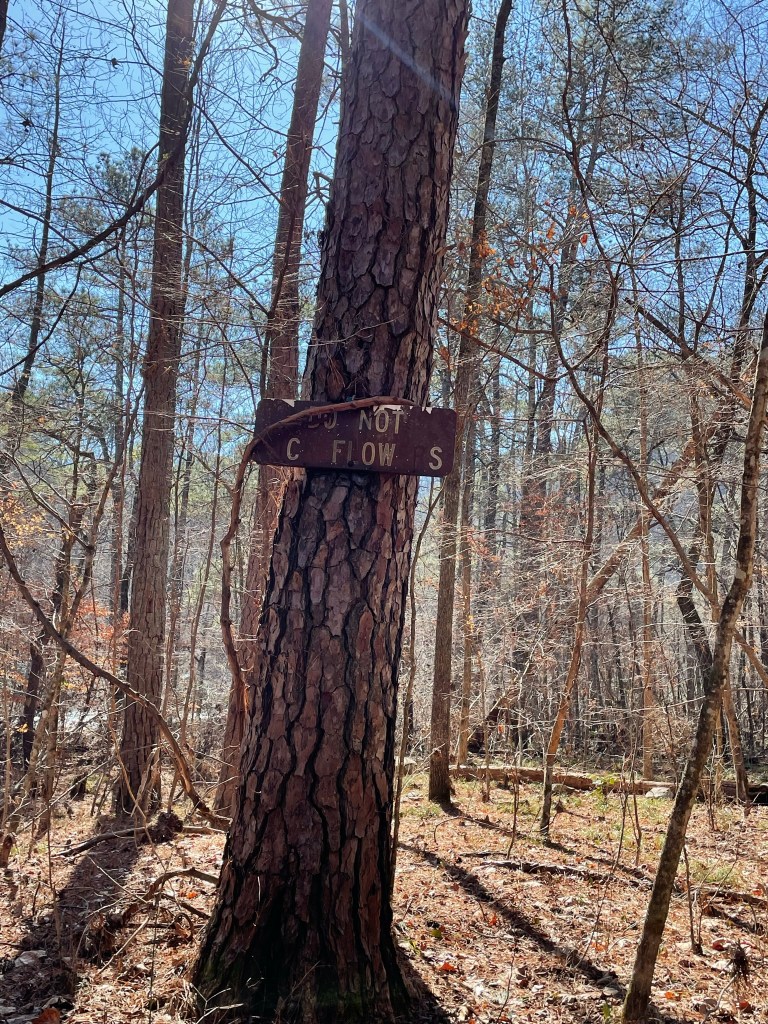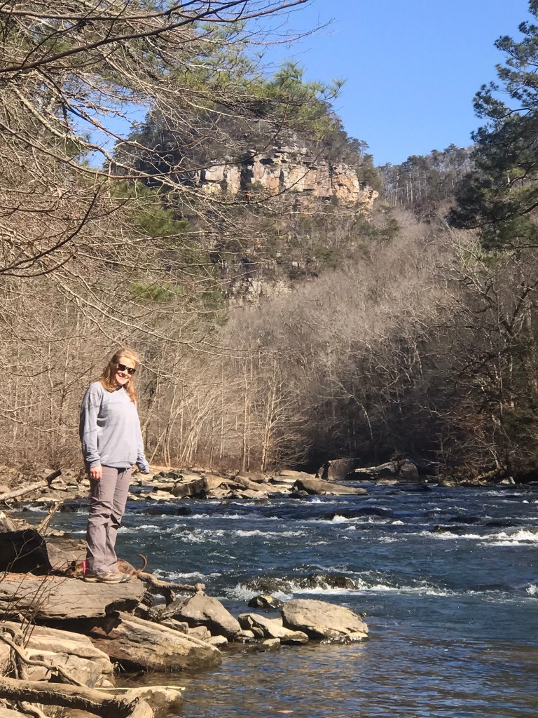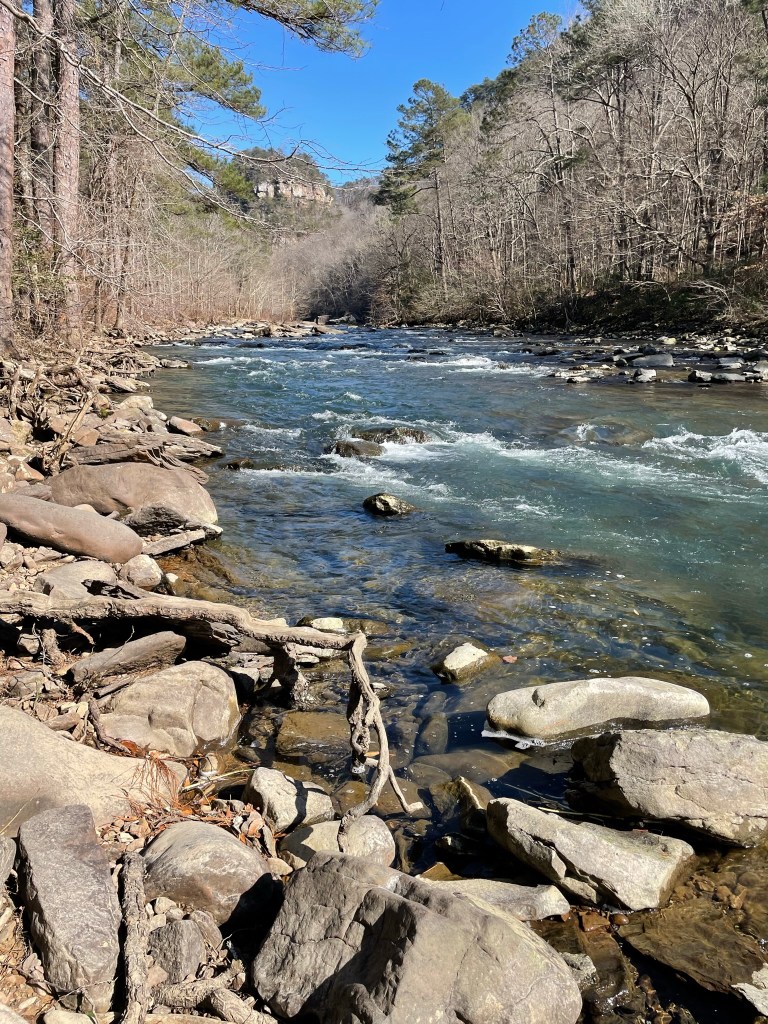 As it was January, and we’d last been here to Little River Canyon in July, we had clearer views of the river from the top of the canyon with the absence of the leaves on the trees. We stopped on the way to the trailhead to take in the views, and got to watch some birds soaring right in front of us. I had hoped they were hawks or eagles, but alas, buzzards. It was still neat to watch them soaring at our level, although we had cause for concern as we were at the top of a cliff, where Jango was keen to get after those birds – and a few times we thought she may actually jump. She was quickly escorted to time out in the truck.