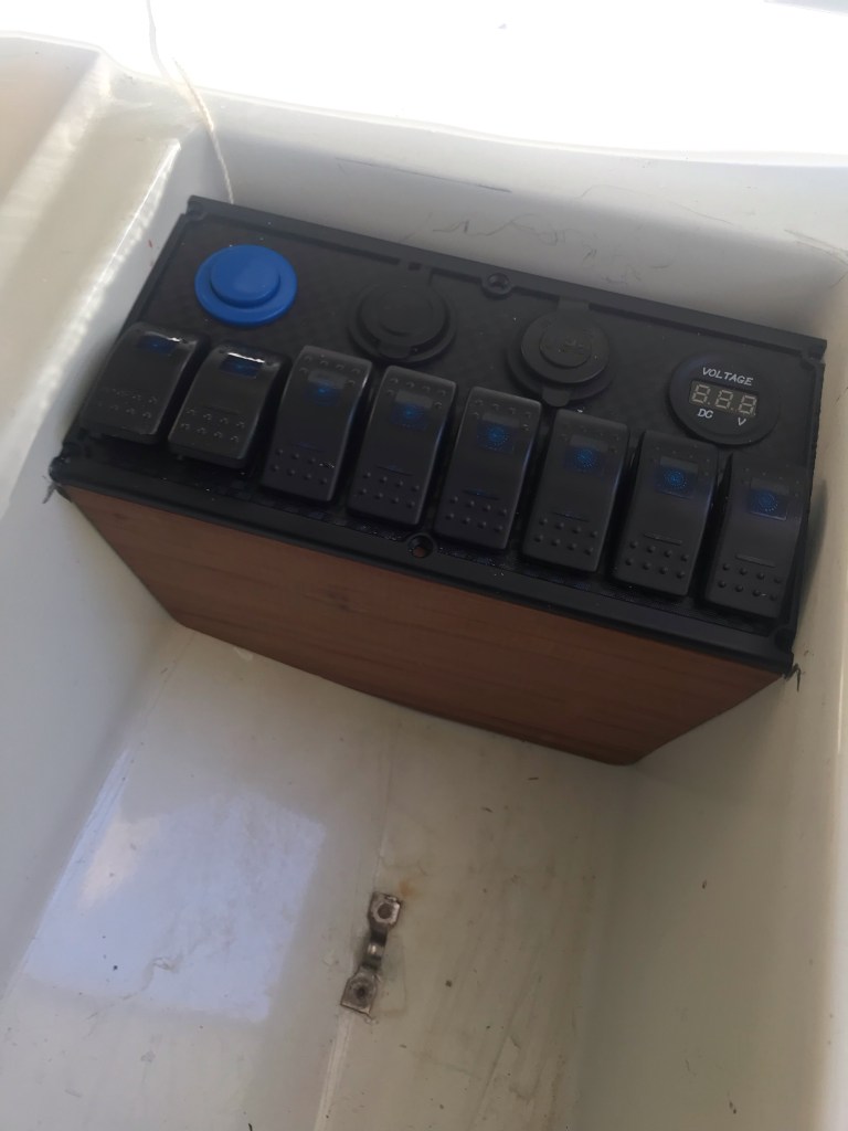 The first thing he did was install this battery with switches, and wire it to the mast light, bow lights, horn, and stern light. It also has voltage to charge cell phones and run the fan in the cabin at night