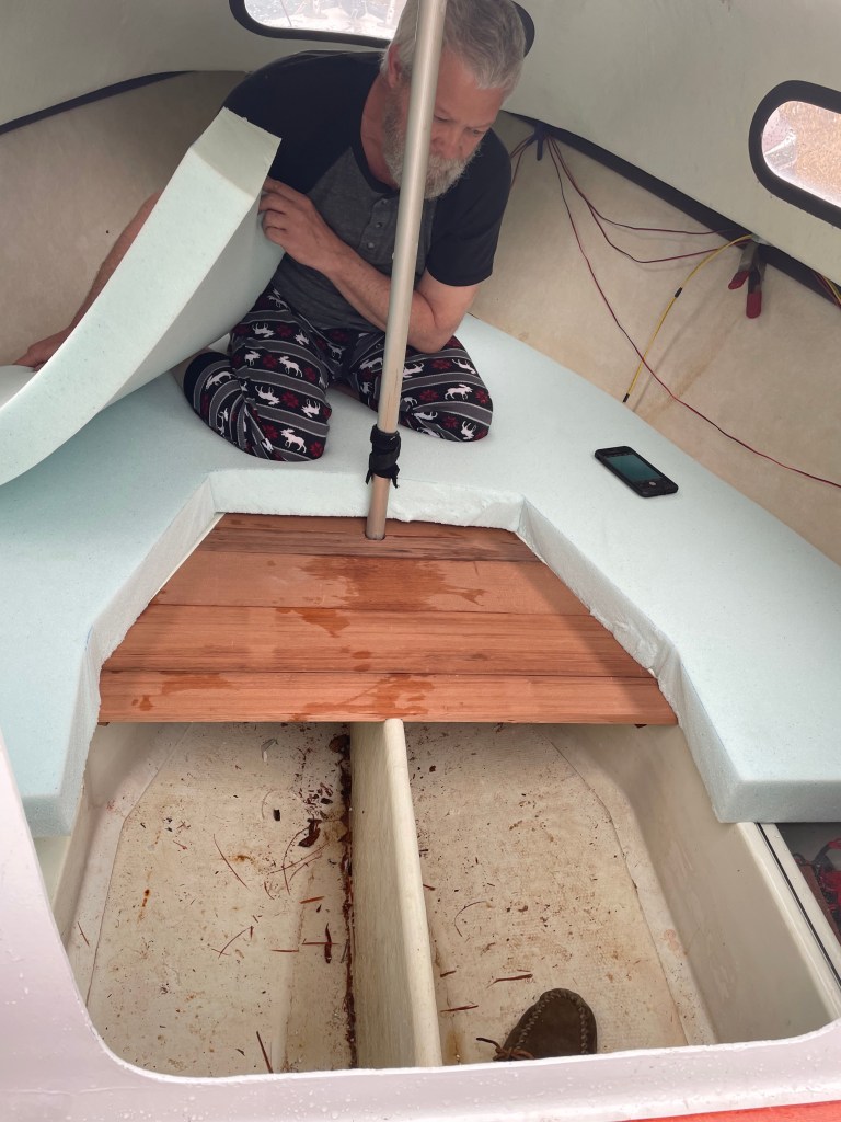 Next, he bought a large piece of memory foam, and measured it and cut It to fit over the benches and the center to make it comfortable for sleeping. We stored the foam in the bow to make room for supplies until we were ready to use it. The visible dirt and debris in the floor there is what I attacked later with the Purple Power.