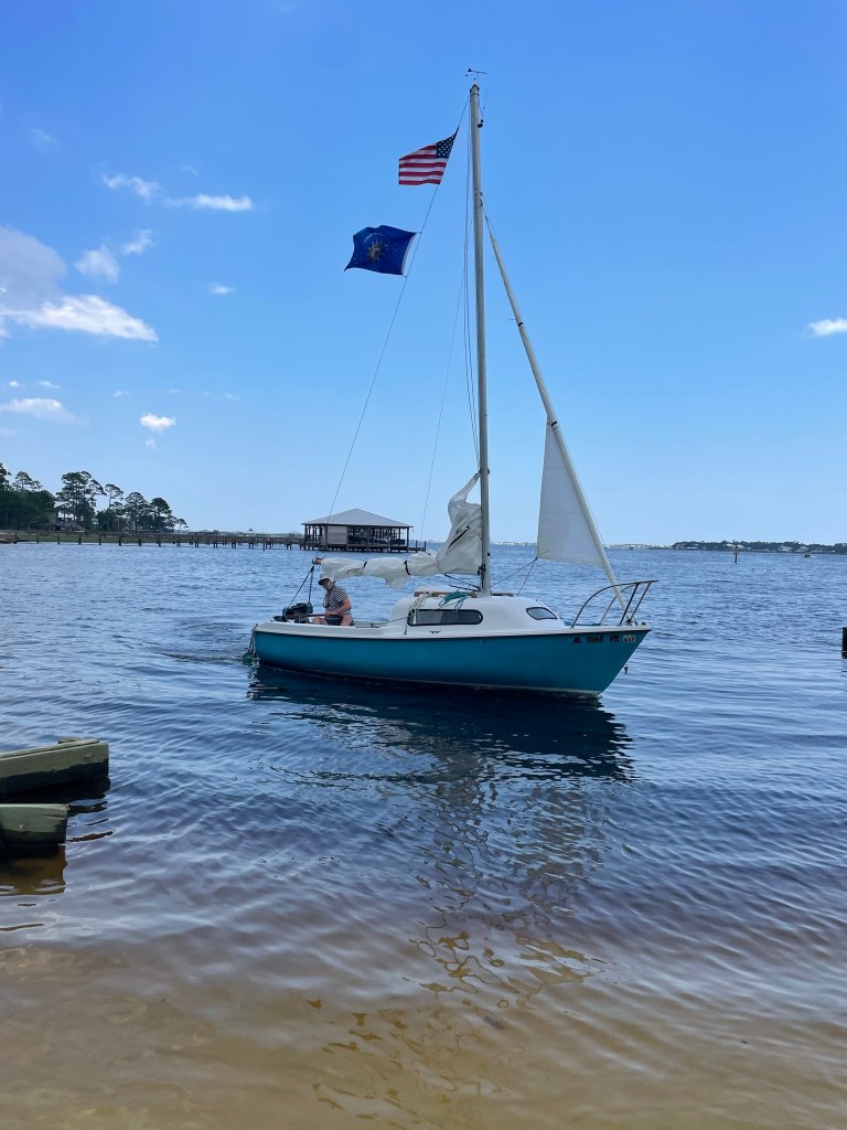 Once we’ve trailered the Shinin’ Brite to a location, it takes us about an hour or so to get her ready to sail; Step (put up) the mast, set the rigging, set the tiller, rudder, and motor, and then untangle and set lines, stays, and sails. As usual, Shannon unloaded her from the trailer and parked the truck and trailer while I used the restroom one more time. This was on June 2, 2022 and it was a hot one!