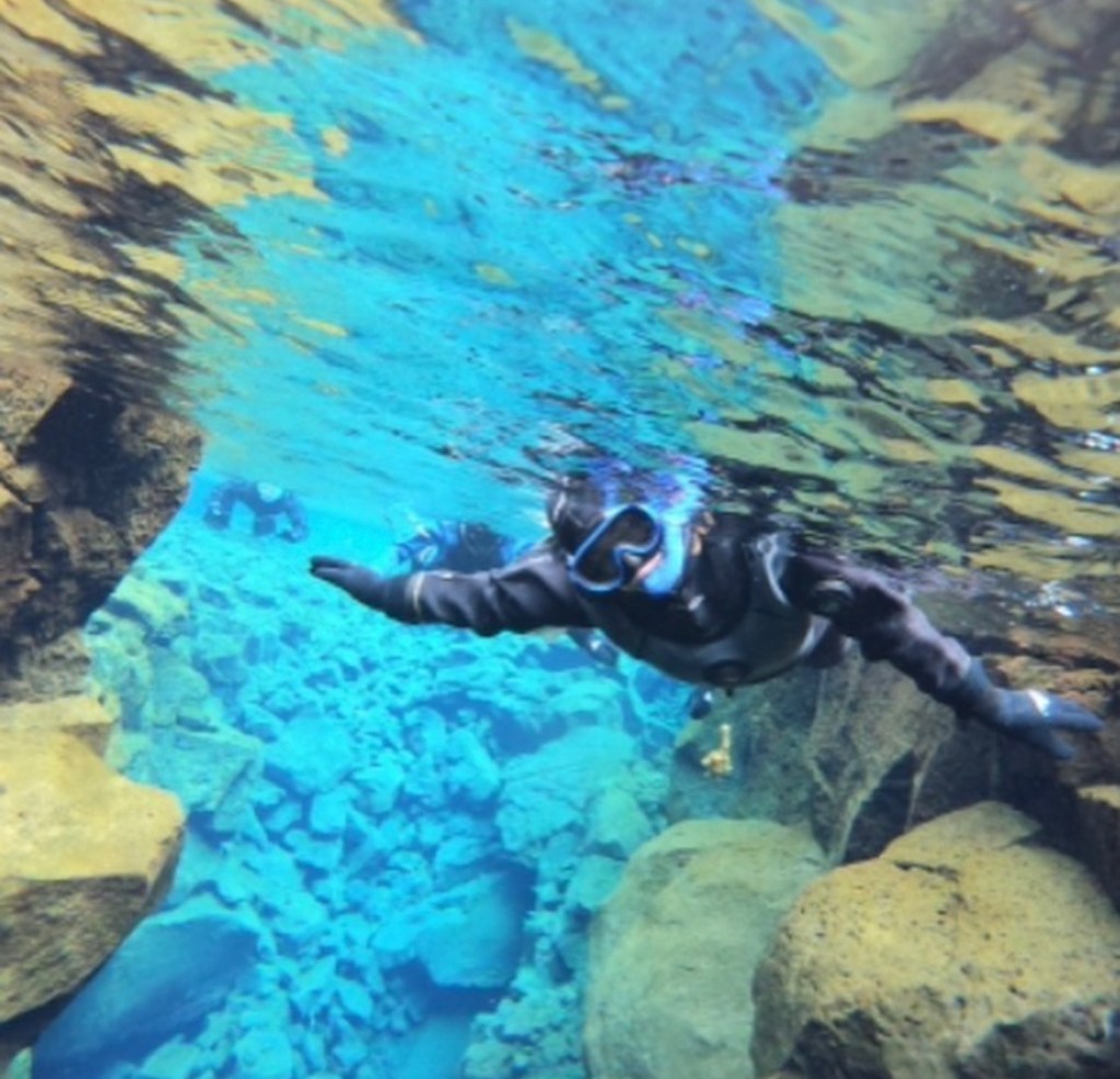 Getting into the dry suit for the dive was an entire event. We were told to bring long underwear and thick socks and “suitable clothes for the weather that day”. It was about 40 degrees out side but we broke a sweat putting the dry suits on, with several rest breaks during the process. Also, they put a rubber band around your neck at the top so that no water seeps in, and it took some getting used to. I was positive I was going to pass out because I could feel it up against my carotid artery. Although the suit does provide a temperature barrier from the water, stepping into said water at first is pretty frigid. The moment you dip your head under however, and get a glimpse of the sights, all else is forgotten and you become spellbound. The serene beauty of what’s visible below surface is absolutely stunning. Divc.Is took us in groups of 5-6, with a guide, who led us on a start-to-finish route that lasted for about an hour. We didn’t want it to end!