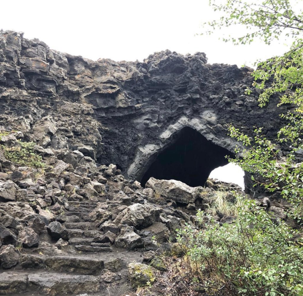The final site in My’vatn we wanted to visit was the Dimmuborgir Lava Pillars. From the site linked there; ” Dimmuborgir, which loosely translated means ‘dark castles’ are thought to have been created about 2300 years ago in the violent throes of an extensive volcanic eruption” It was a neat place. Paved paths wind around and through the rock pilars and it feels like something enchanted from a storybook. “There are three different marked routes for walking the labyrinth of ethereal lava formations ” In Nordic Christian lore, this is the place that is believed to be where Satan landed when he was cast out of heaven where he created the catacombs of hell. Pretty cool, hey? Sign us up!!! We were amused to learn the stories of the “Yule Lads” (linked there). It seems that there are about 13 of them that have hung around to see the 2000’s, and they’re described as “ill-mannered” imps who sleep in their cave during the summer, but emerge, one at a time, 13 days leading up to Christmas eve”. ANYWAY – it was fun!