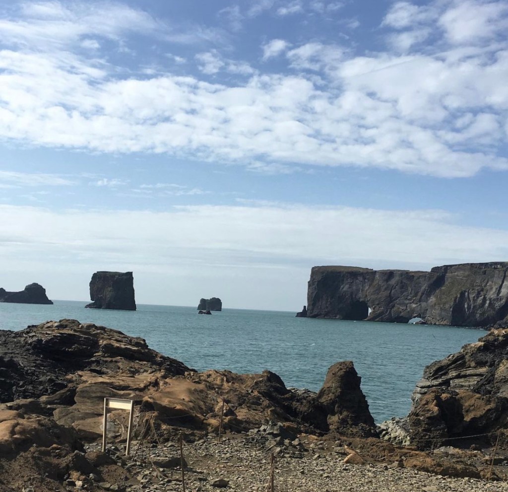 Dryholaey is a small peninsula just outside of Vik. The name means “door hole” which comes from the arch of lava here. There were Puffins nesting on the coast in this spot, flying in and out of a rock just by the path and we saw them up close. It was still difficult to get a good photo with an iphone.