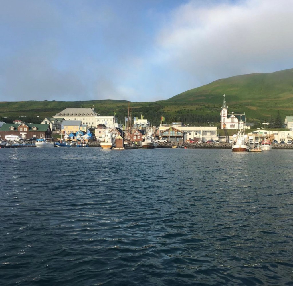 The beautiful town of Husavik, taken from the boat, in calmer waters upon return from Whale watching