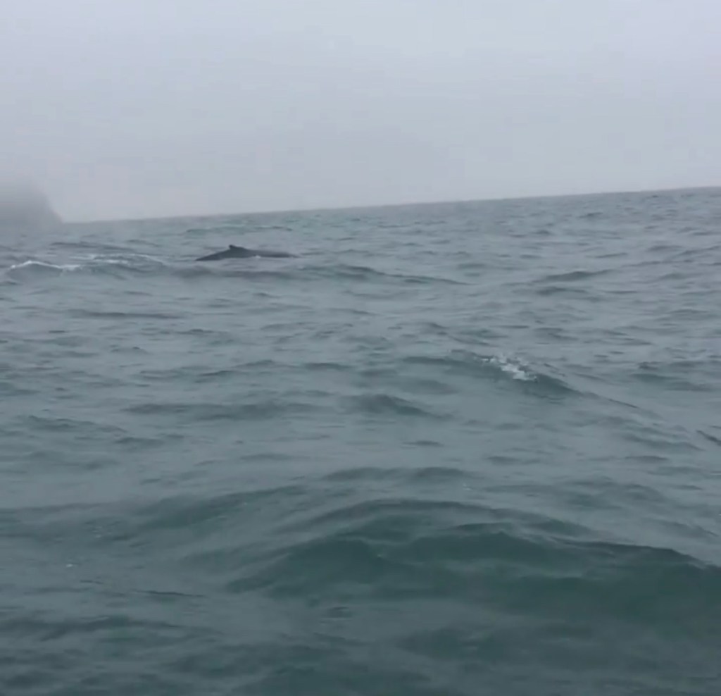 We saw lots and lots of humpback whales. It was incredible. We watched them breech the surface, blow from their blow holes, and one even gave us a slow belly roll with a wave of his fin. We also saw some porpoises swimming with the whales, and jumping through the waves, which was great fun as well. Once we had a break in the action, the captain (standing behind us in the photo), passed around small plastic shot glasses with shots of Brennivin, which is an Icelandic liquor similar to Vodka (info linked). The Brennivin was a fun way to celebrate the moment, and as the boat ride and getting to see the whales was overwhelmingly thrilling, it was easy to celebrate! We stayed in the company of the whales for a full half hour, before heading back to shore.