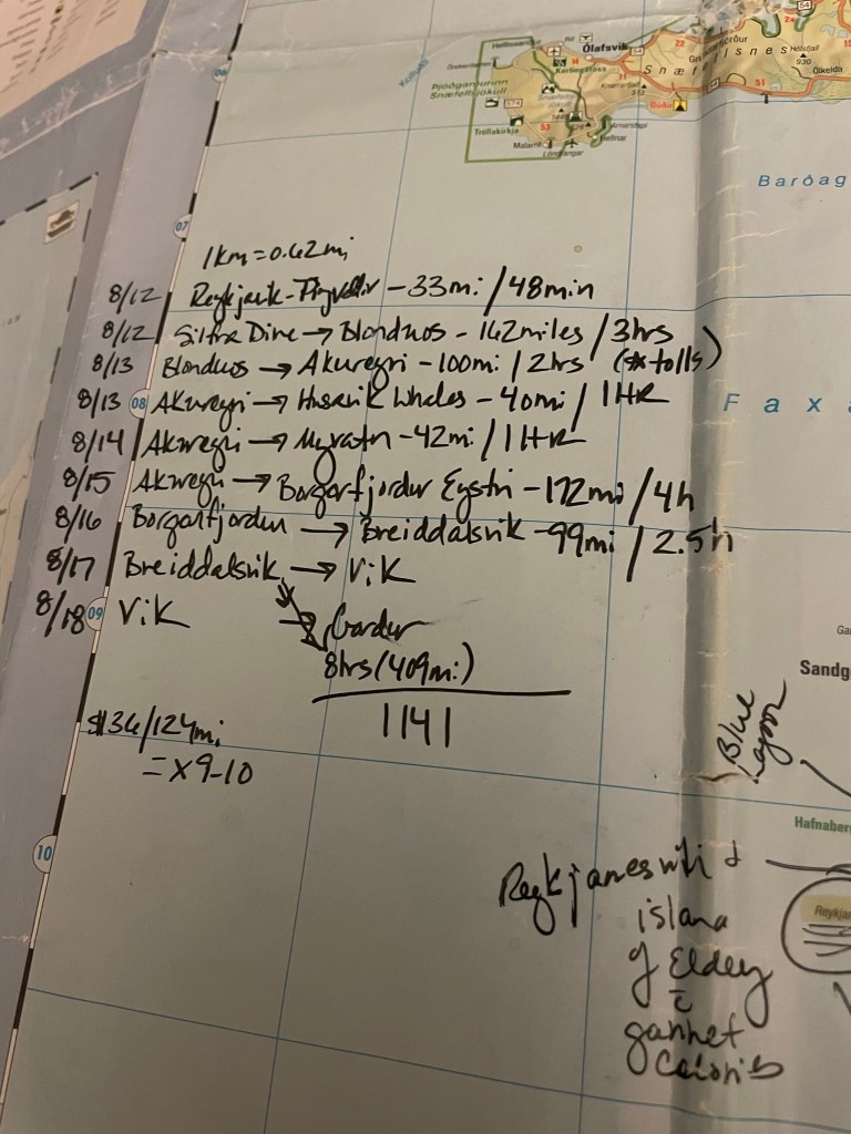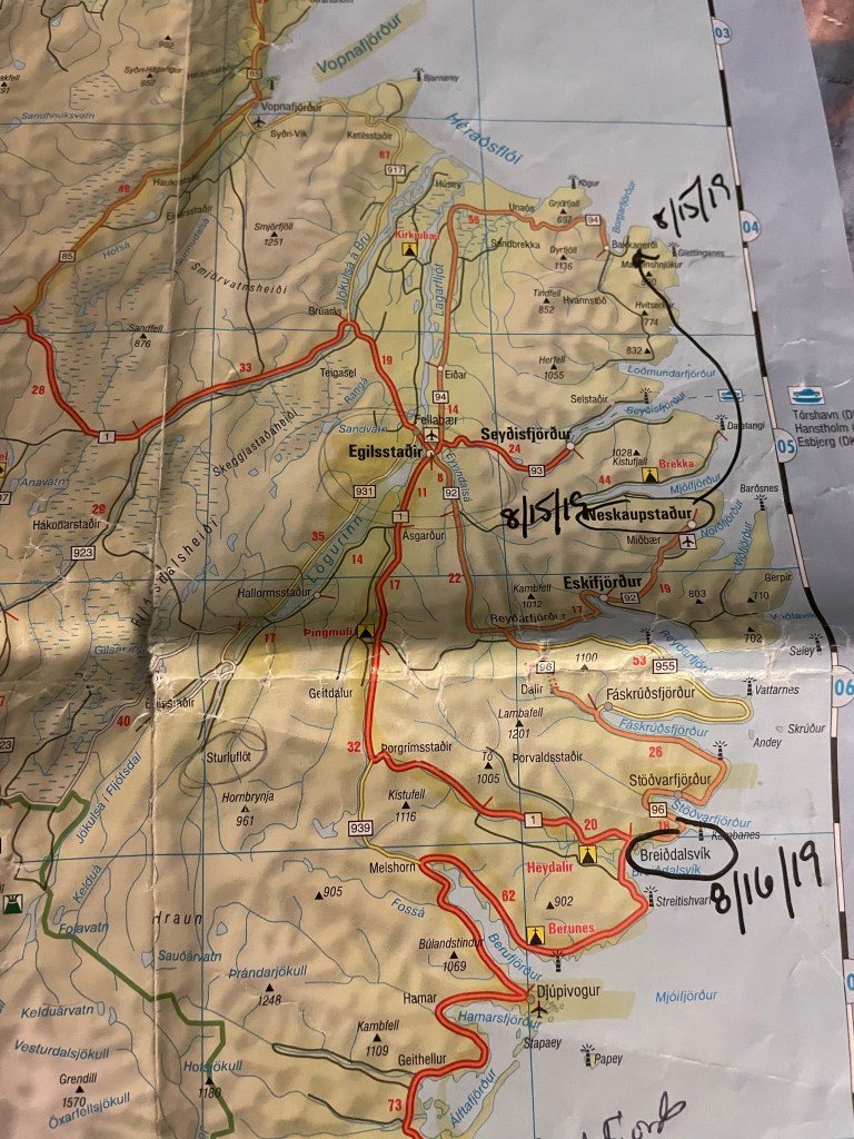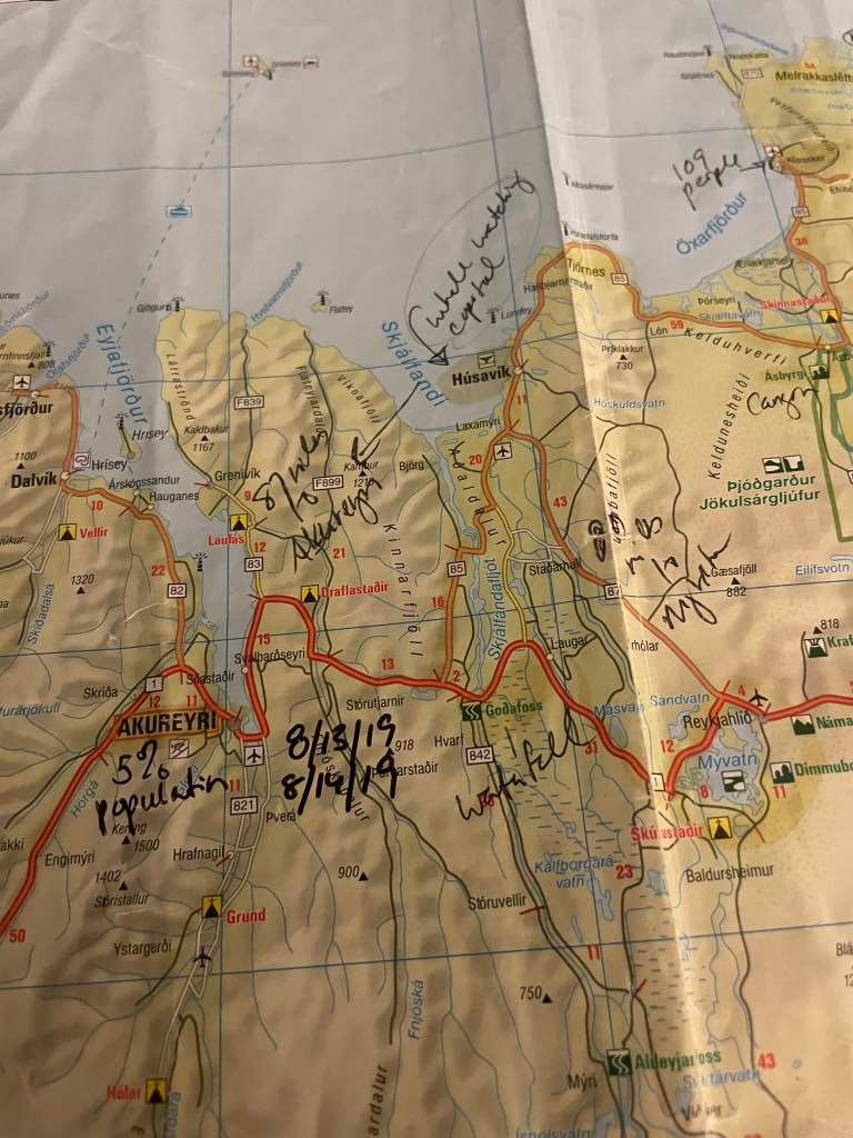 We had a 4 hour drive ahead of us, or so we thought. We didn’t leave Husavik until around 6pm, satisfied that we’d make it to our next BnB by around 10pm. We read in our guidebook that there are sections of roads off of the main “ring road” that we would want to avoid. The roads weren’t paved and could make for a rough ride. Somehow we took a wrong turn and ended up going the long long long way, on the non-paved roads, and yet, somehow, miraculously ended up getting to our correct destination in the obscure town of Borgorfjordur (Marked beside 8/15/19 below).