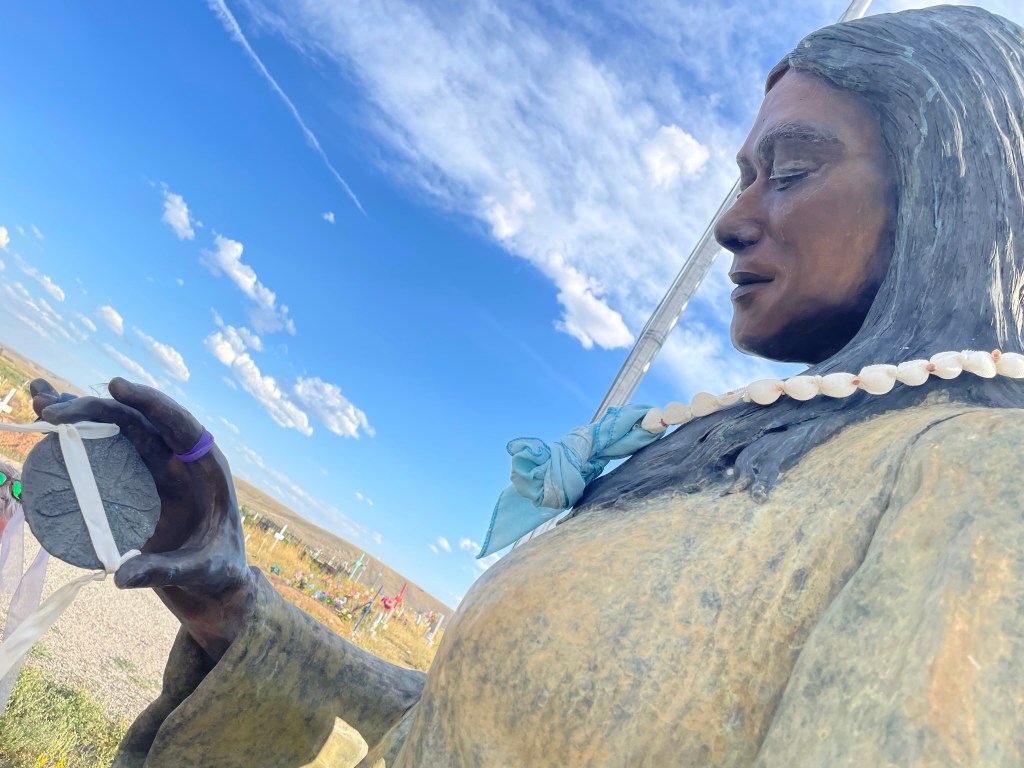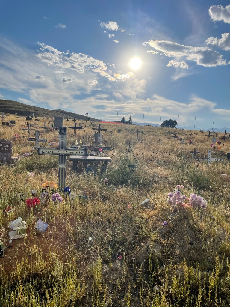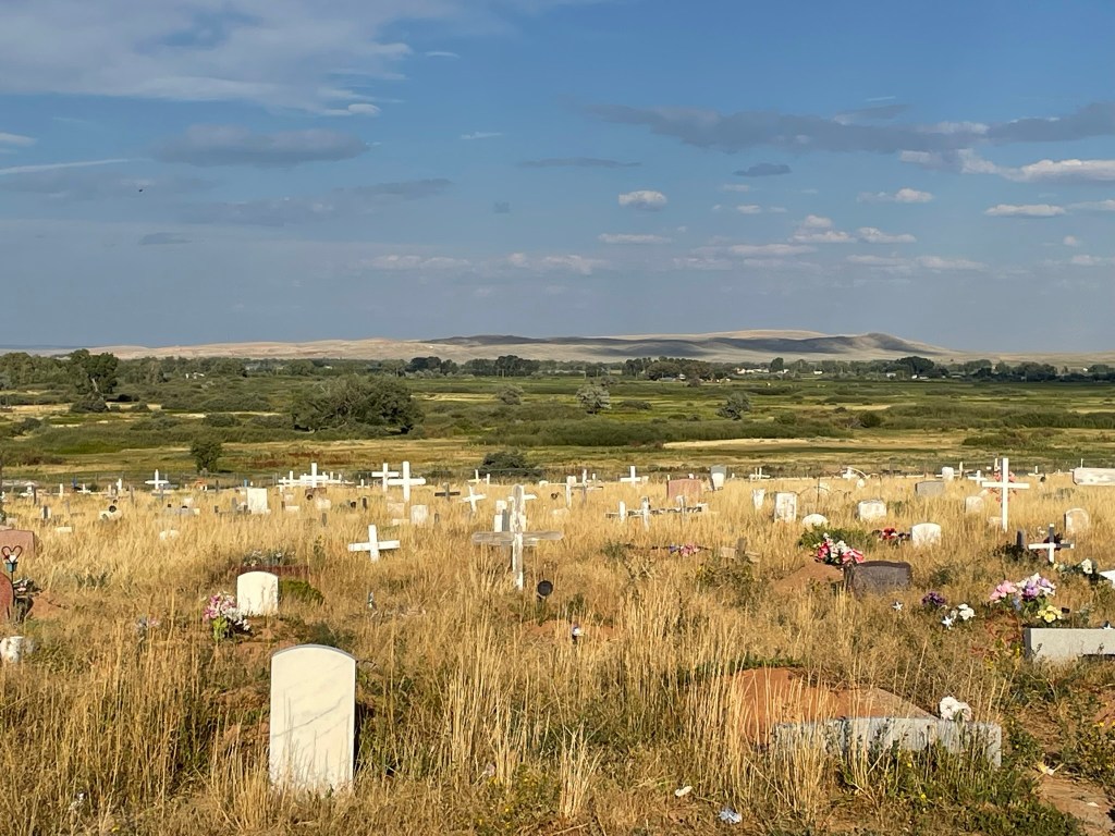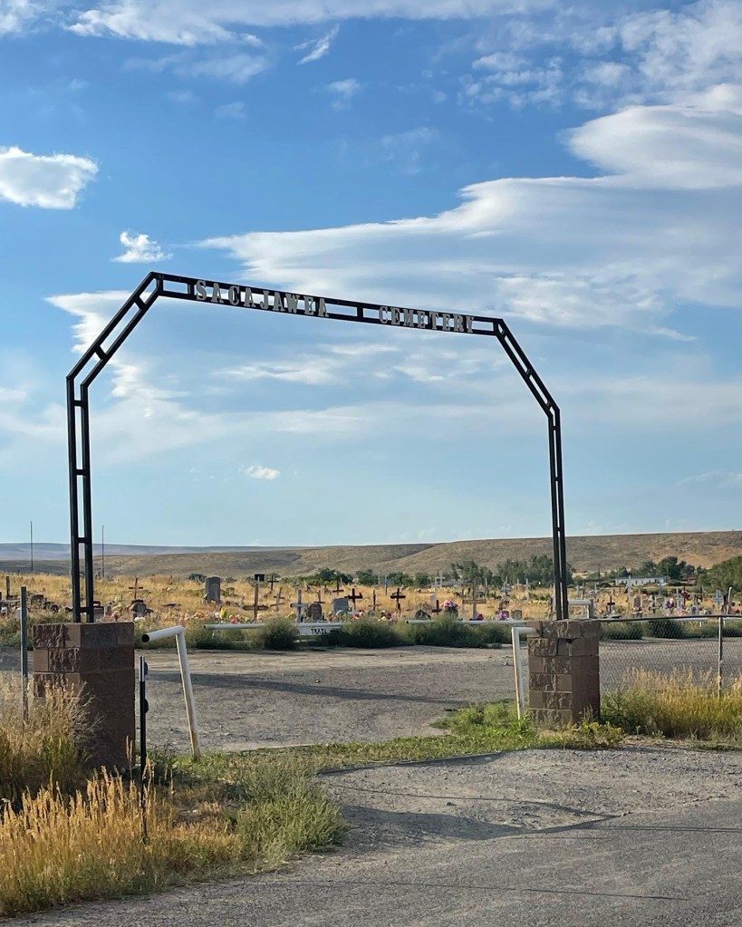 We flew to Denver, Colorado and drove North. First through Laramie where Shannon lived, and then on up into Lander where we planned to stay the night. Once we got to Lander, we drove a little past it to the Shoshone reservation to visit the Sacajawea cemetery, and to see her final resting place. It was not only a spectacularly beautiful spot, but cool and interesting. We spent the better part of an hour exploring gravesites.