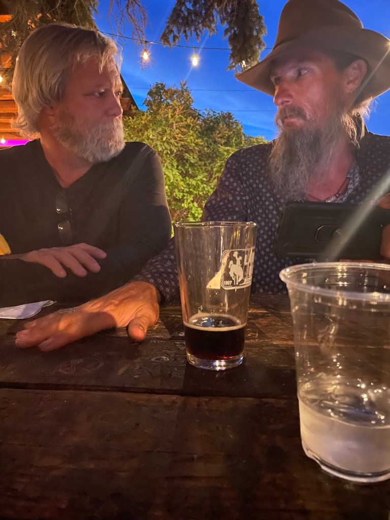 Before we made our way back to the Holiday Inn Express in Lander (for the last shower and bed-rest for the next few days), we set out to find some dinner. What we found was a fun outdoor dining experience with live music! We were at the Lander Bar, and the burger restaurant that was just next door, the Gannett Grill. Here, you order your food and drinks and walk out to the courtyard to enjoy your meal at long picnic tables with friends. The band performing on stage called “Sugarr Shak” out of Fort Collins, CO, were a lot of fun! We were soon joined by a lively crew of buffalo ranchers and their girlfriends, and had a big time chatting with them.