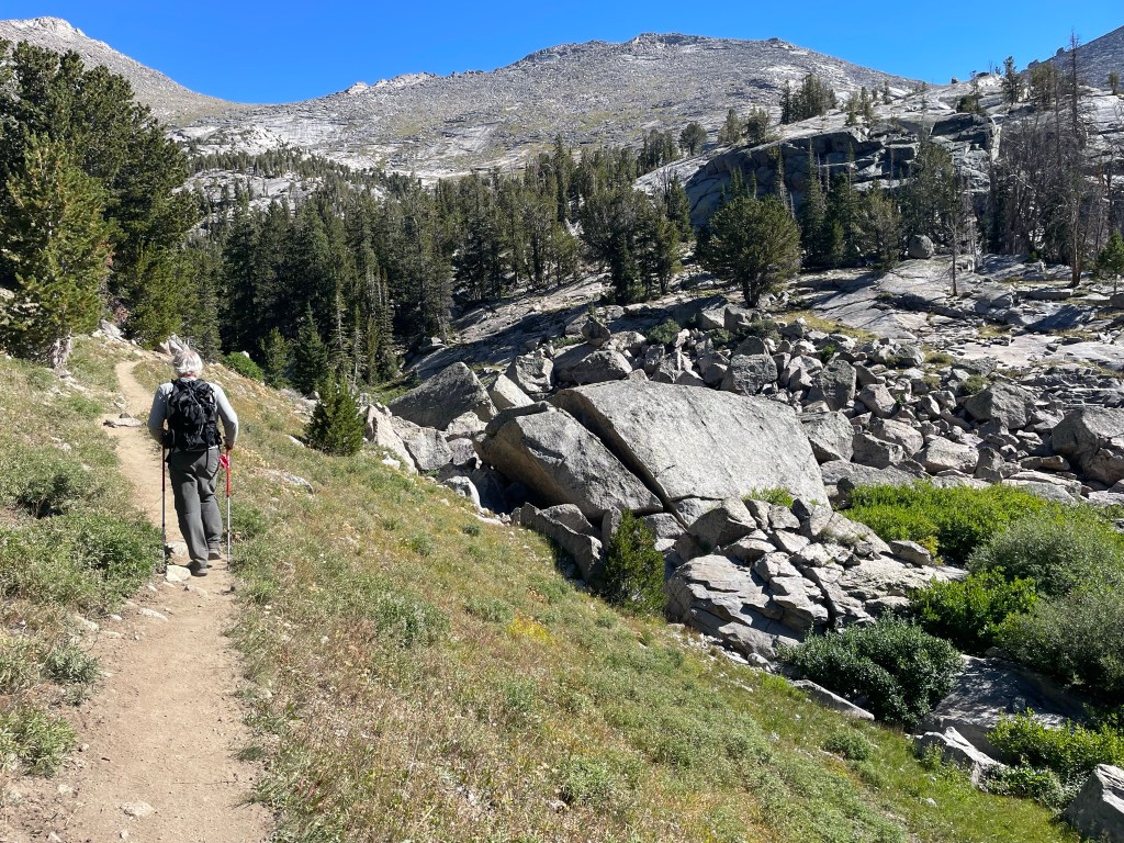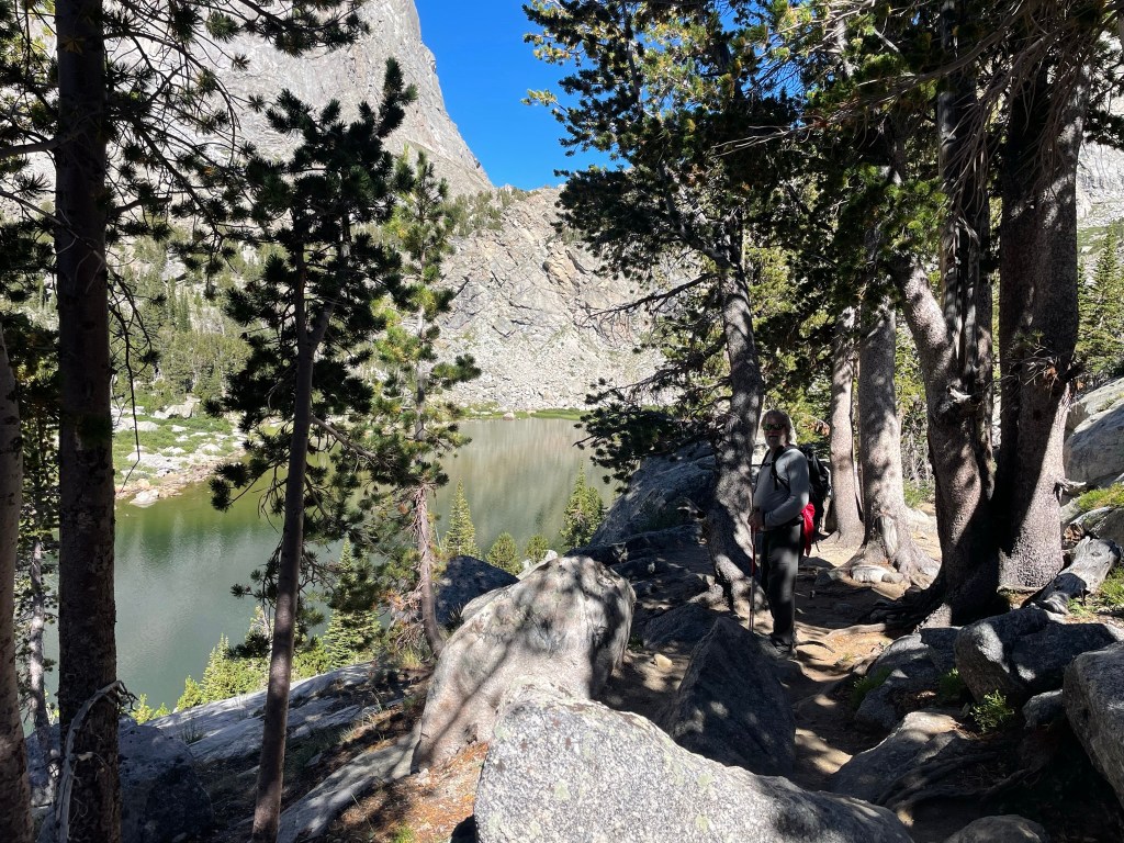 There was another steep climb up and around Arrowhead Lake, and when we got up and over the top of it we heard a cheerful “happy birthday!” We came face to face with Tim Hardy from my previous post. He had already been to the Cirque on his own, and Sue had opted to stay behind with a good book. It was fun to stop and chat with our new friend from back home in Alabama.