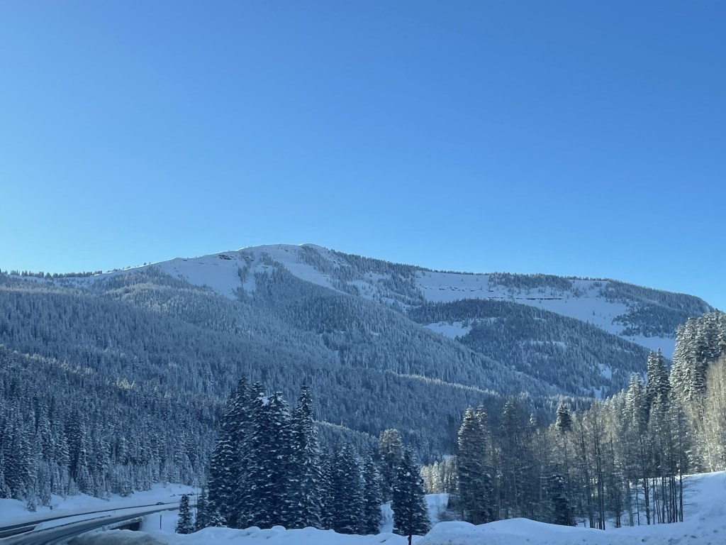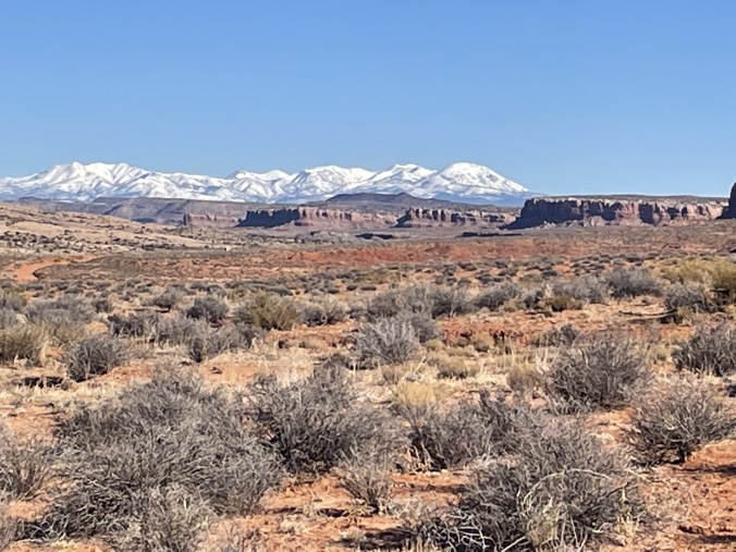 Driving in to the Butler Wash/Comb Ridge area, and the snow-covered La Sal range