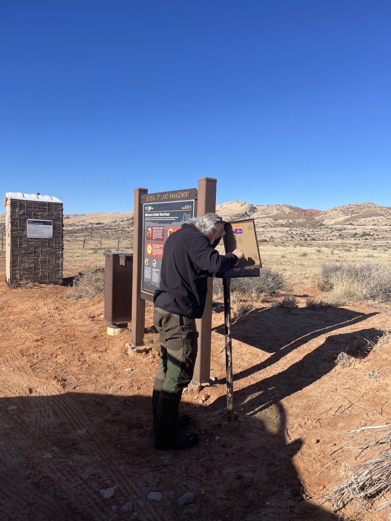 It’s only about 100 miles to Bluff, Utah from Moab, and another 10-15 minutes to the Butler Wash road entrance to Comb Ridge. There’s a small sign as you enter the dirt road, and just beyond there is a BLM station to pay your fees and get your corresponding parking passes. The port-o-john’s there were possibly the cleanest ones I’ve ever seen – likely due to the fact that it was January and “low season” for tourism.