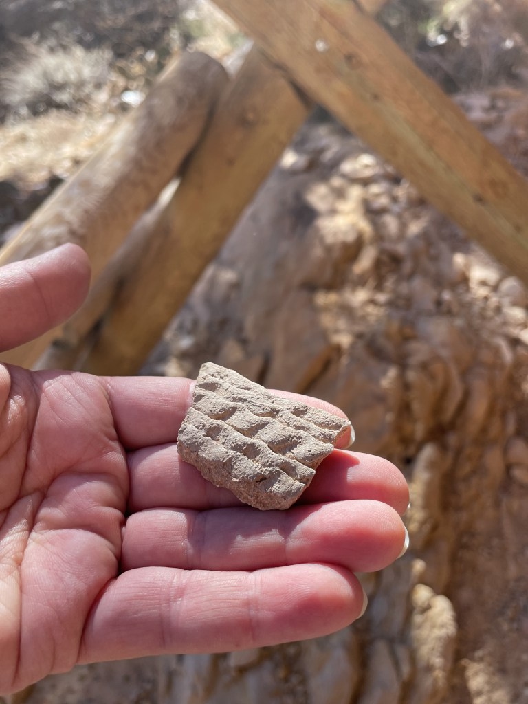 Back to the ruins…. there were pottery pieces all over the ground, and sitting on ledges throughout the ruins, where folks had located the pieces and put them up for others to enjoy: