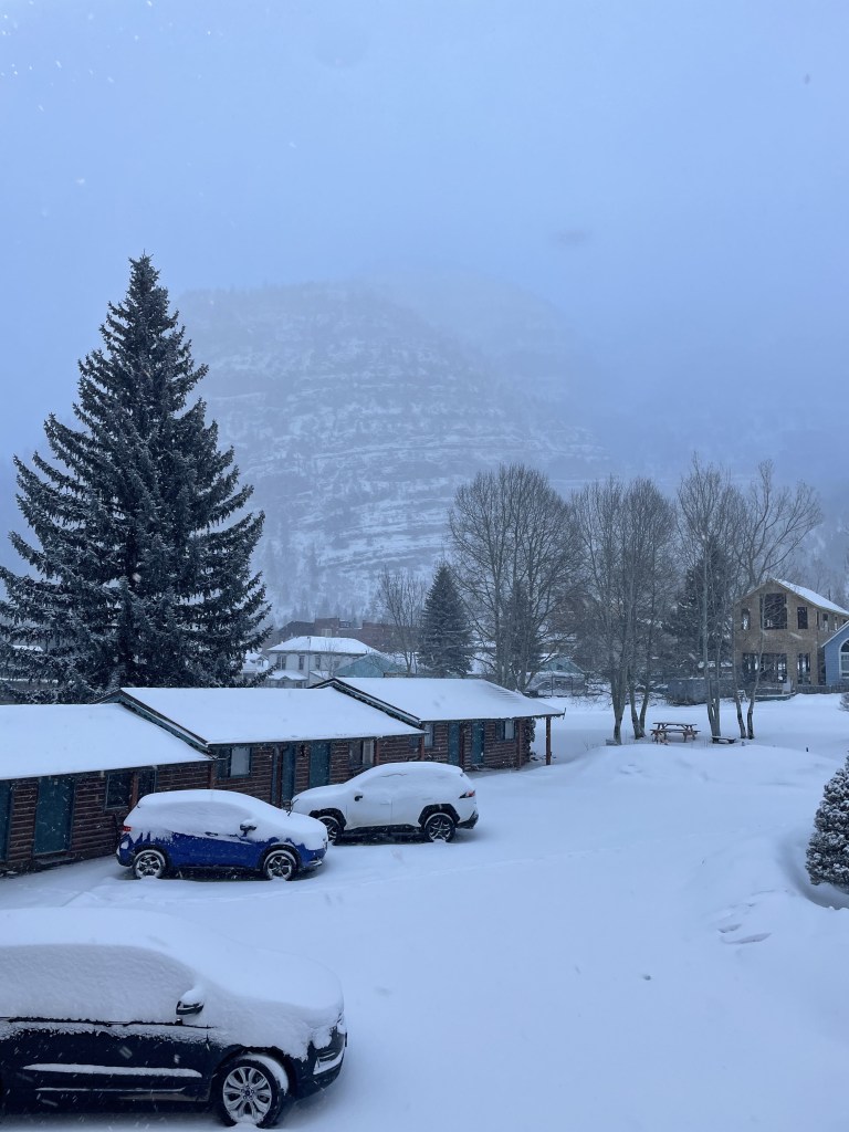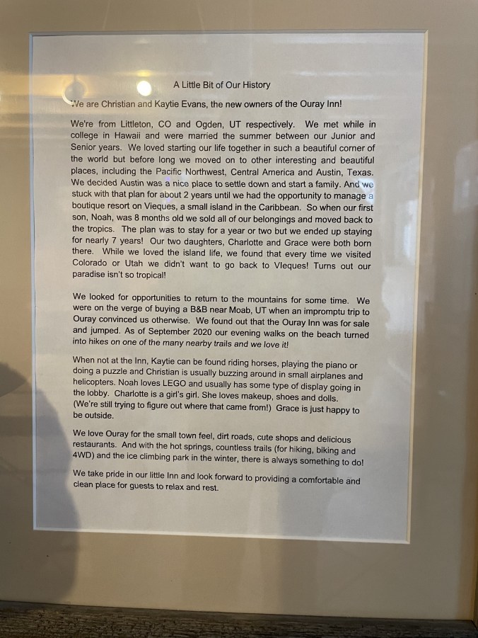 We found the greatest place to stay in Ouray, the Ouray Inn (linked), and I’m excited to tell about it because it was perfect. When we got there, there was a man out scraping the ice off of the parking lot. He and his dog greeted us, and walked us in to get us checked in. I noticed his photo with a wife and children behind the front desk and inquired about his family. I was immediately smitten with this adorable family: