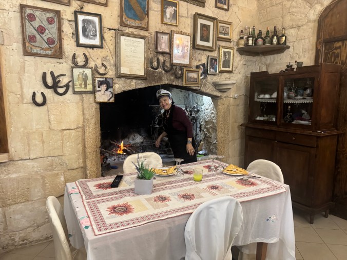 At the first photo stop, the Masseria Cippano, there was a couple camping in a van about 300 yards away, near the dirt road, and at the Santa Maria di Constantinople o Madonna chapel, there were no other people anywhere. When we arrived at Torre Pinta, we were greeted by a middle-aged woman. We somehow communicated that we were interested in the key to the hypogeum, she said “ will you stay for lunch? We looked at each other and said “sure!” It was lunchtime after all. She said “I will prepare a table!”