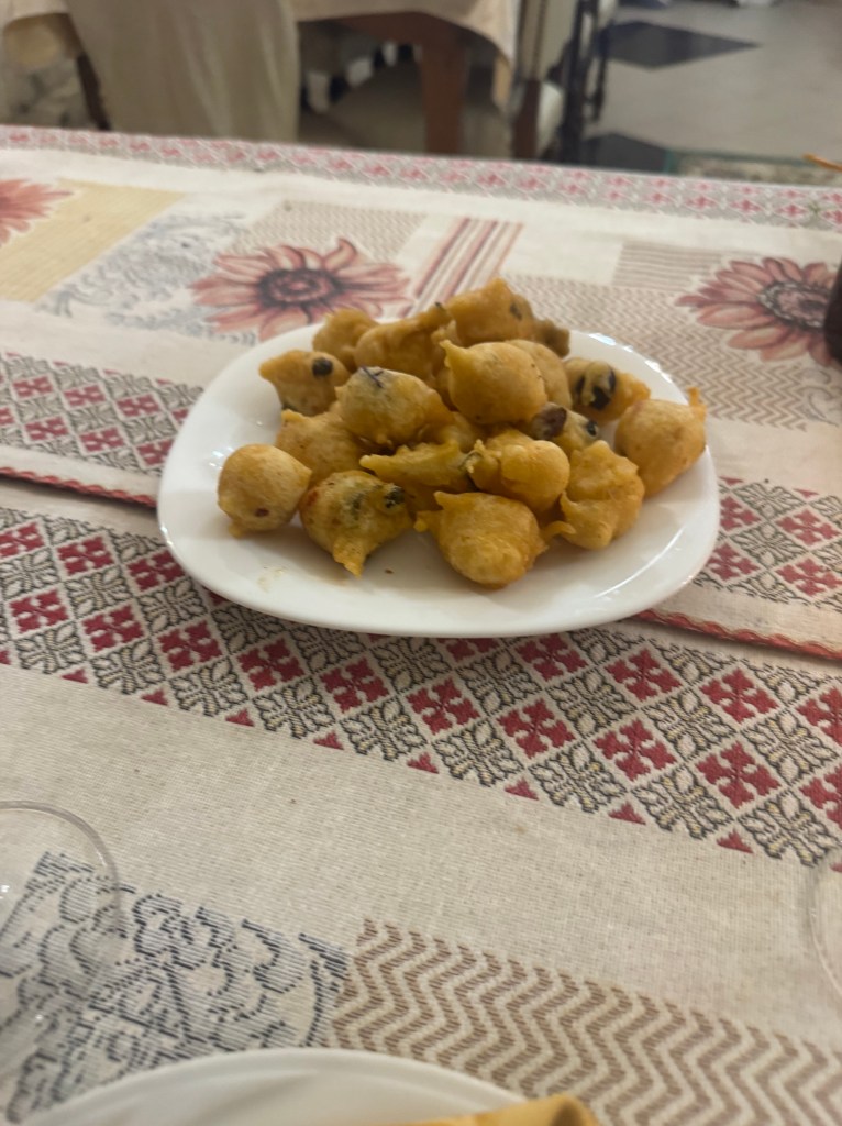 Maria started bringing out dish, after dish, after dish. We were hungry, and ready to eat. The only question she asked us about our meal was if we wanted red, white, or rose’. We ordered red – and were surprised when she brought us a bottle. In the video above, Shannon is munching on the first thing she brought out – fried balls of dough with chopped up black olives and tomatoes.