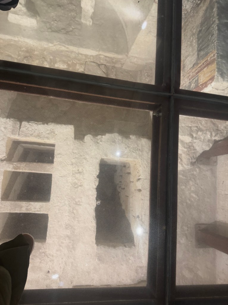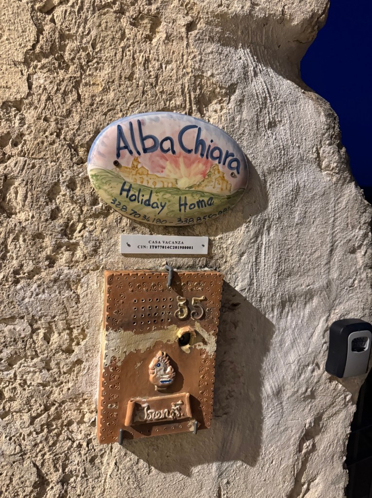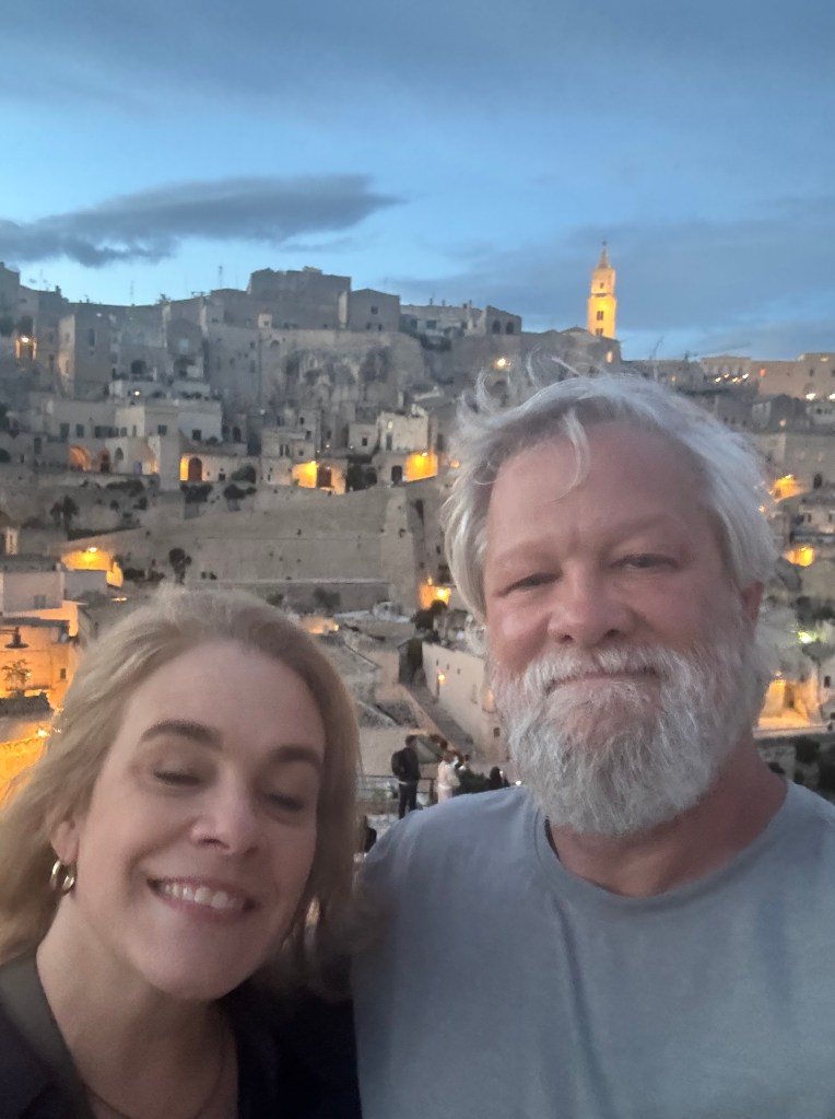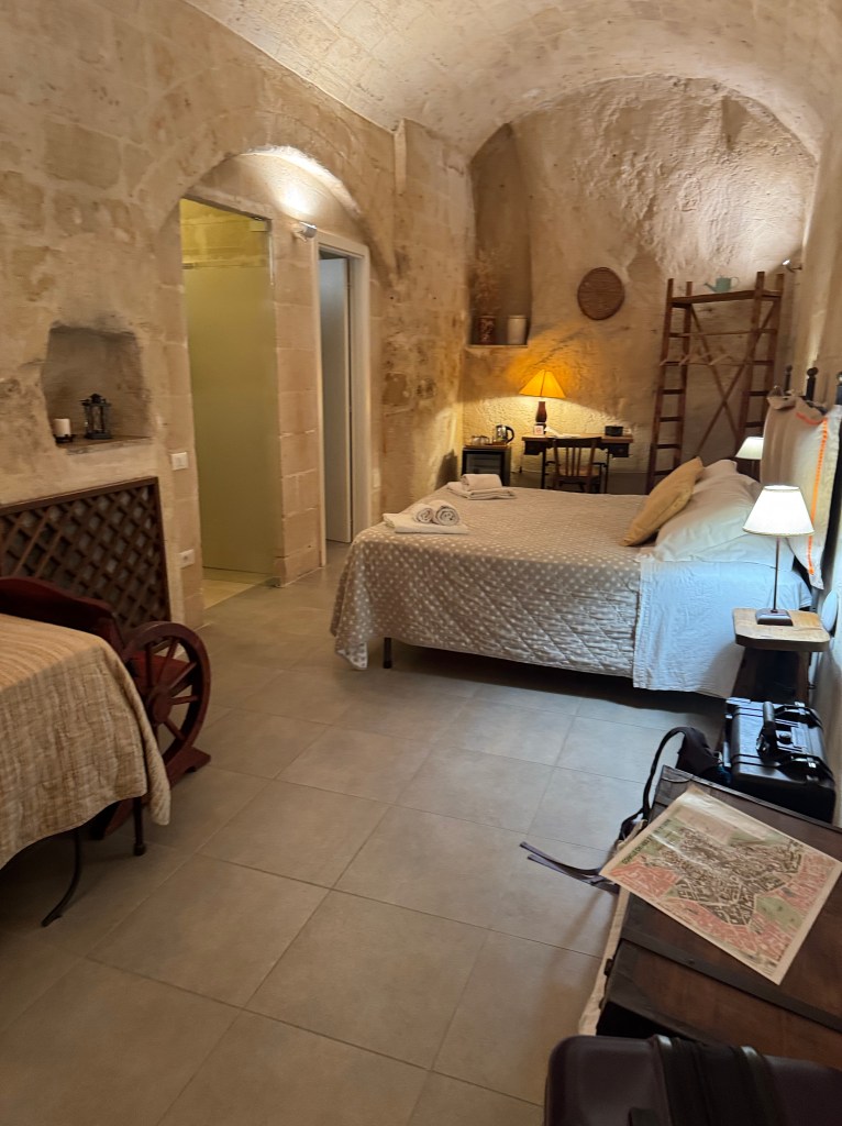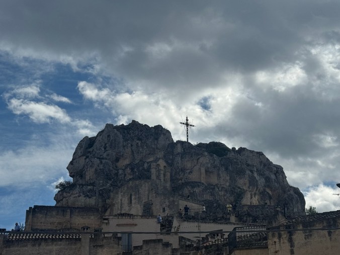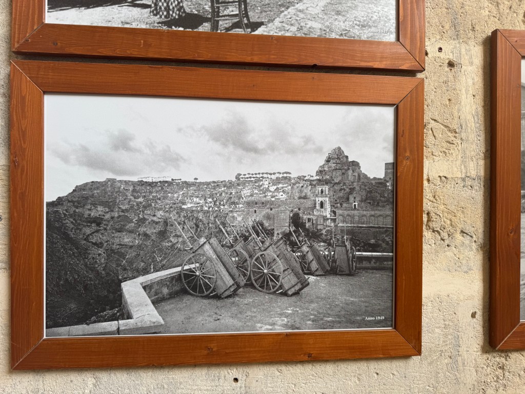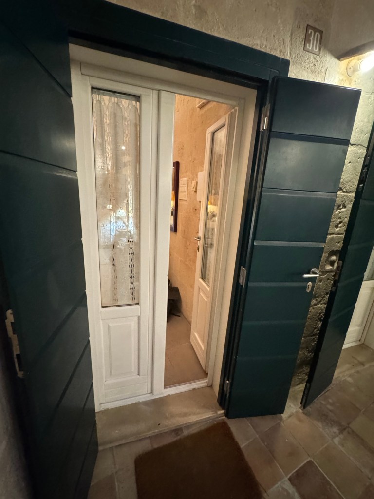 - Side note – you’ll notice that there are no cars allowed in the Centro Storico (old town) of Matera. This is the case in most of the towns we visited. In this case, Shannon had arranged for us to park in a parking deck, about a mile away, for the 3 days we were visiting, and he’d arranged for a shuttle to take us from the parking deck, to as close as possible to our hotel. When the shuttle dropped us off, it was still a bit of a trek over cobblestone sidewalks, carrying our luggage. We’d done enough research to know to expect this, and packed as lightly as we possibly could for our 2 weeks here. Here’s a video of part of that walk: