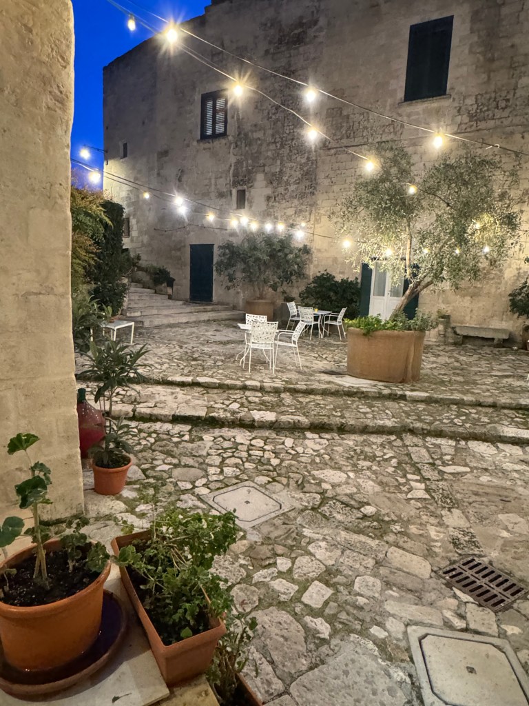 Shannon knew that I really wanted to stay at one of the new boutique hotels made within the sassi. He found a fantastic one that we absolutely loved!! It was called Le Dodici Lune (12 Moons) and it was excellent in every way. We had a gorgeous room with an adorable courtyard (complete with olive trees and string lights), a wonderful host named Alexandra that was very happy to help us find things and make recommendations, and an incredible breakfast each morning!