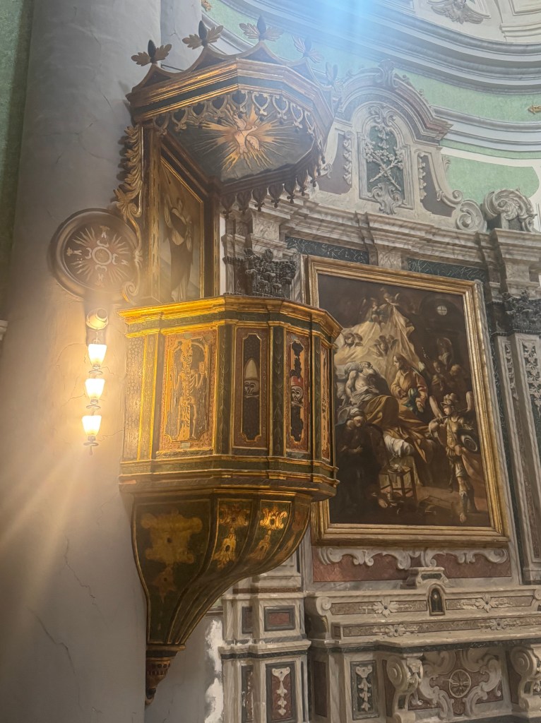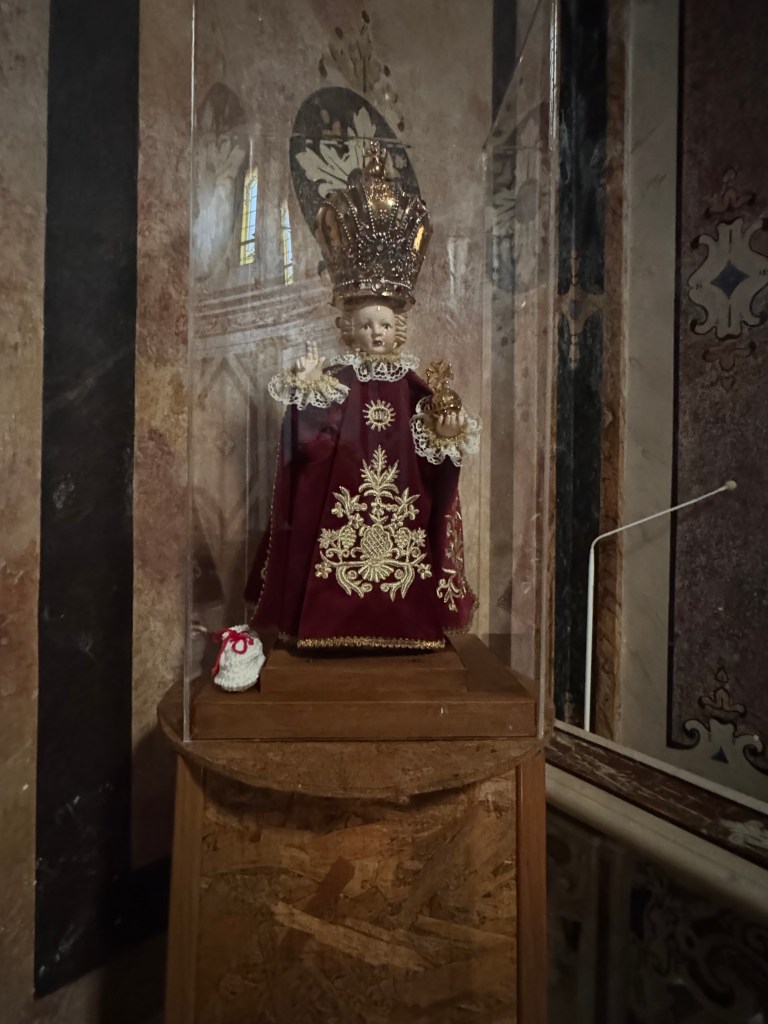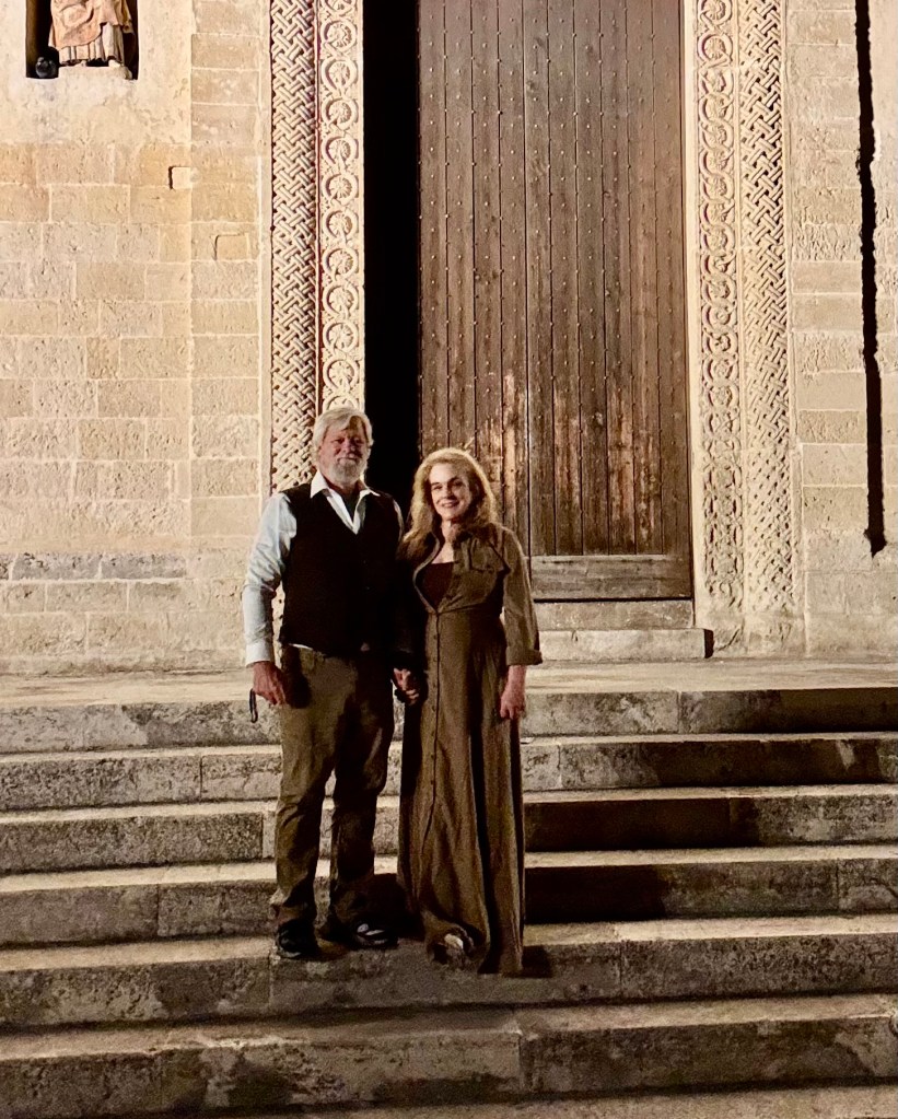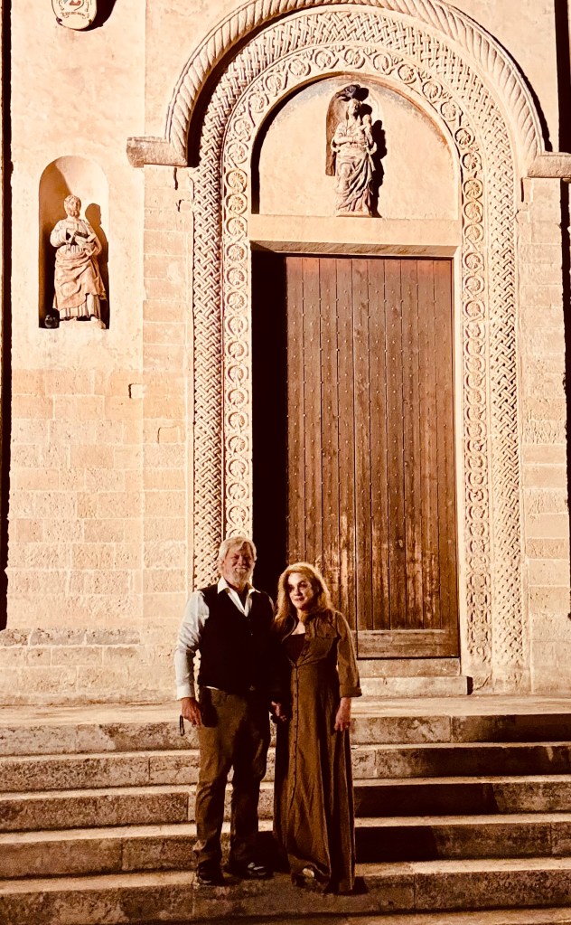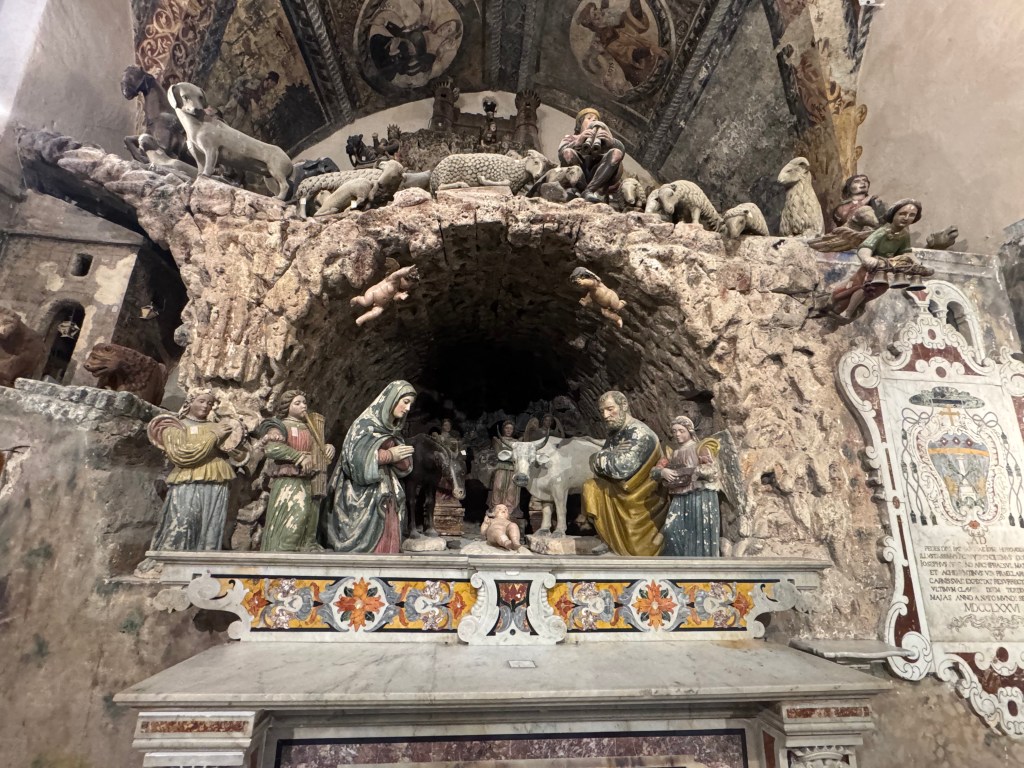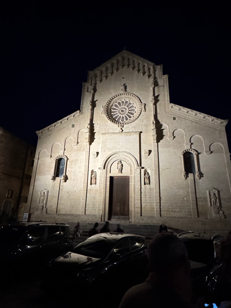We also decided to go inside the Duomo piazza church, The Cathedral of Matera, which has the official name of – “the Cattedrale Maria SS Della Bruna E Sant’Eustachio”. This church is said to be the main catholic place of worship of Matera, the mother church of the archdiocese of Matera-Irsina. We are not catholic, so I’m not entirely sure what all of that means. It was built in the Romanesque Apulian style in the 13th century. Building was begun on the current cathedral in 1230, and completed in 1270. This church was absolutely stunning! I was particularly taken by what I’d call the life-sized nativity scene! First, here are a few of our wedding photos, from around midnight on 10/25/25, on the steps of this Cathedral:
