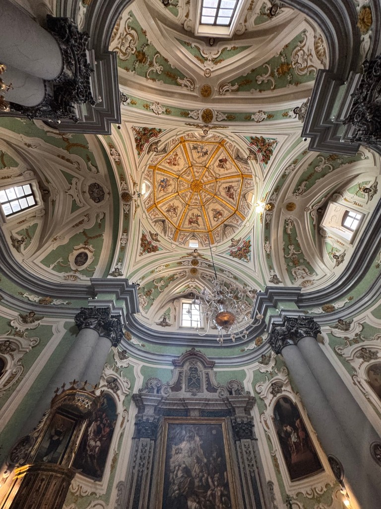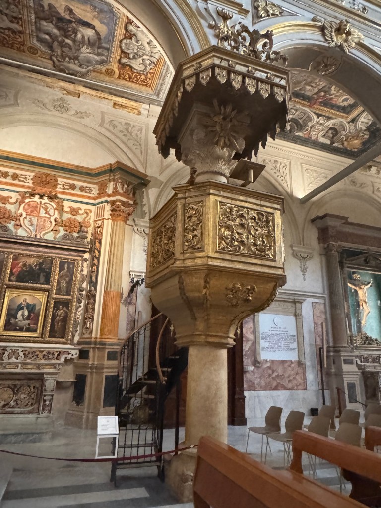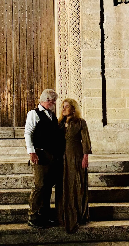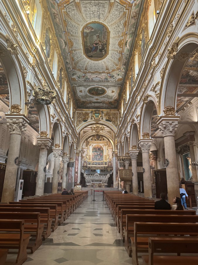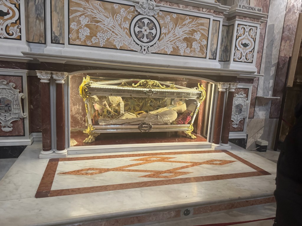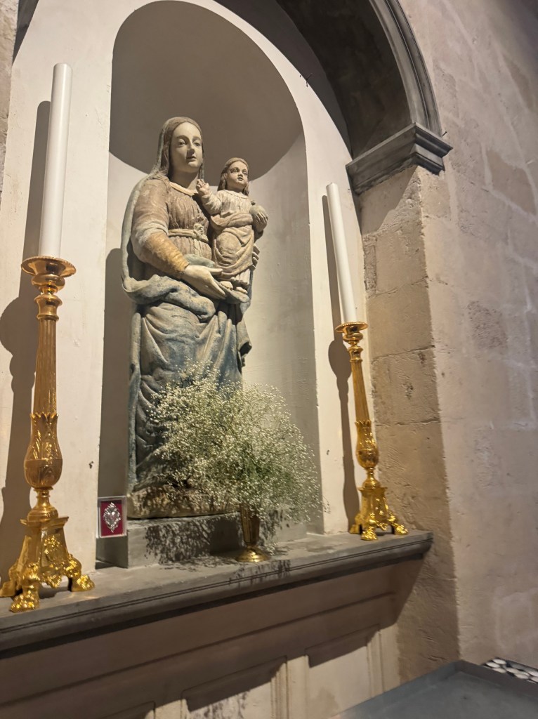 We also decided to go inside the Duomo piazza church, The Cathedral of Matera, which has the official name of – “the Cattedrale Maria SS Della Bruna E Sant’Eustachio”. This church is said to be the main catholic place of worship of Matera, the mother church of the archdiocese of Matera-Irsina. We are not catholic, so I’m not entirely sure what all of that means. It was built in the Romanesque Apulian style in the 13th century. Building was begun on the current cathedral in 1230, and completed in 1270. This church was absolutely stunning! I was particularly taken by what I’d call the life-sized nativity scene! First, here are a few of our wedding photos, from around midnight on 10/25/25, on the steps of this Cathedral: