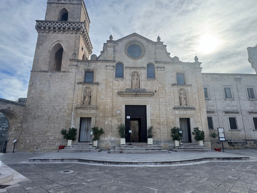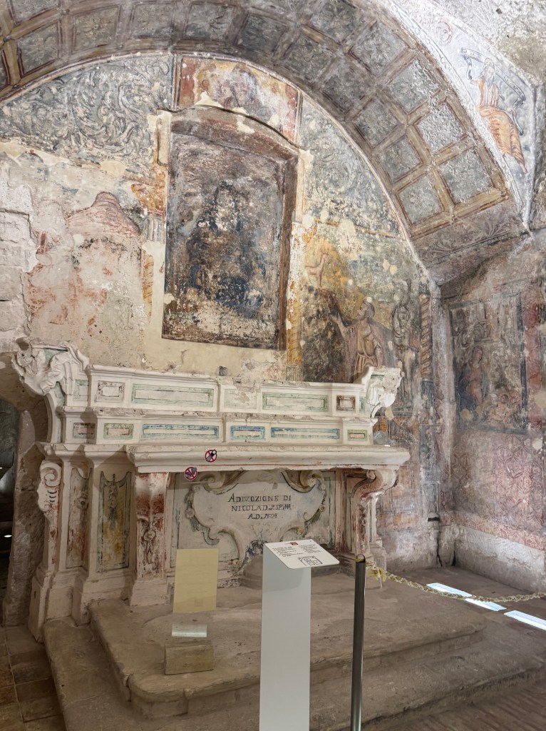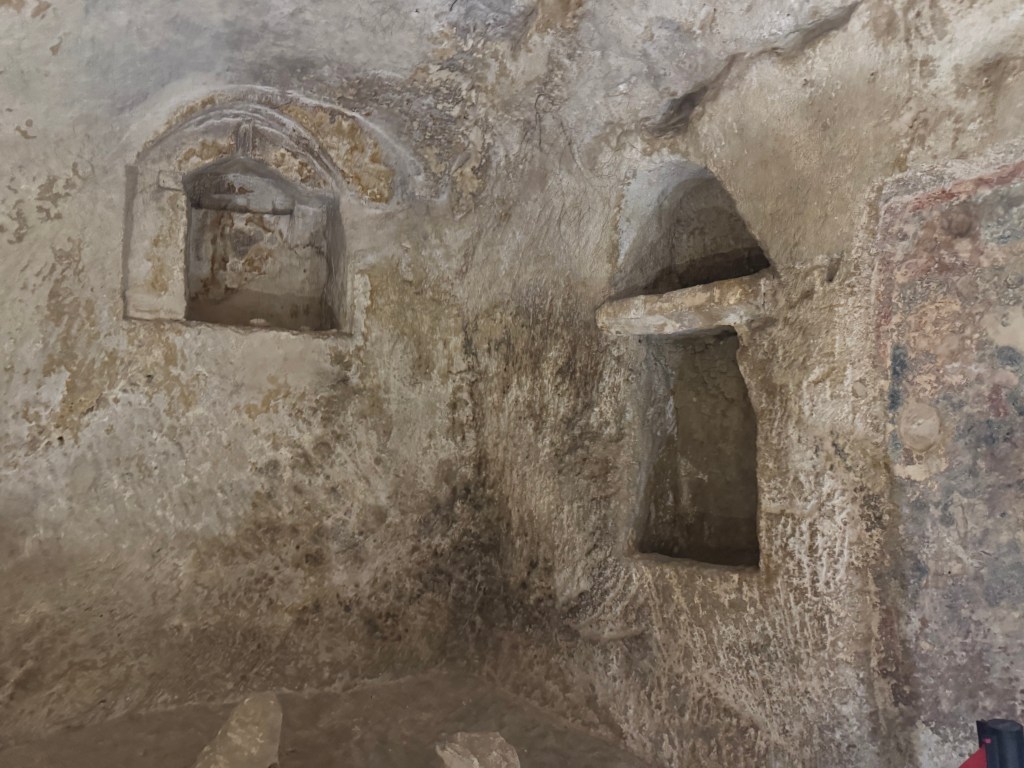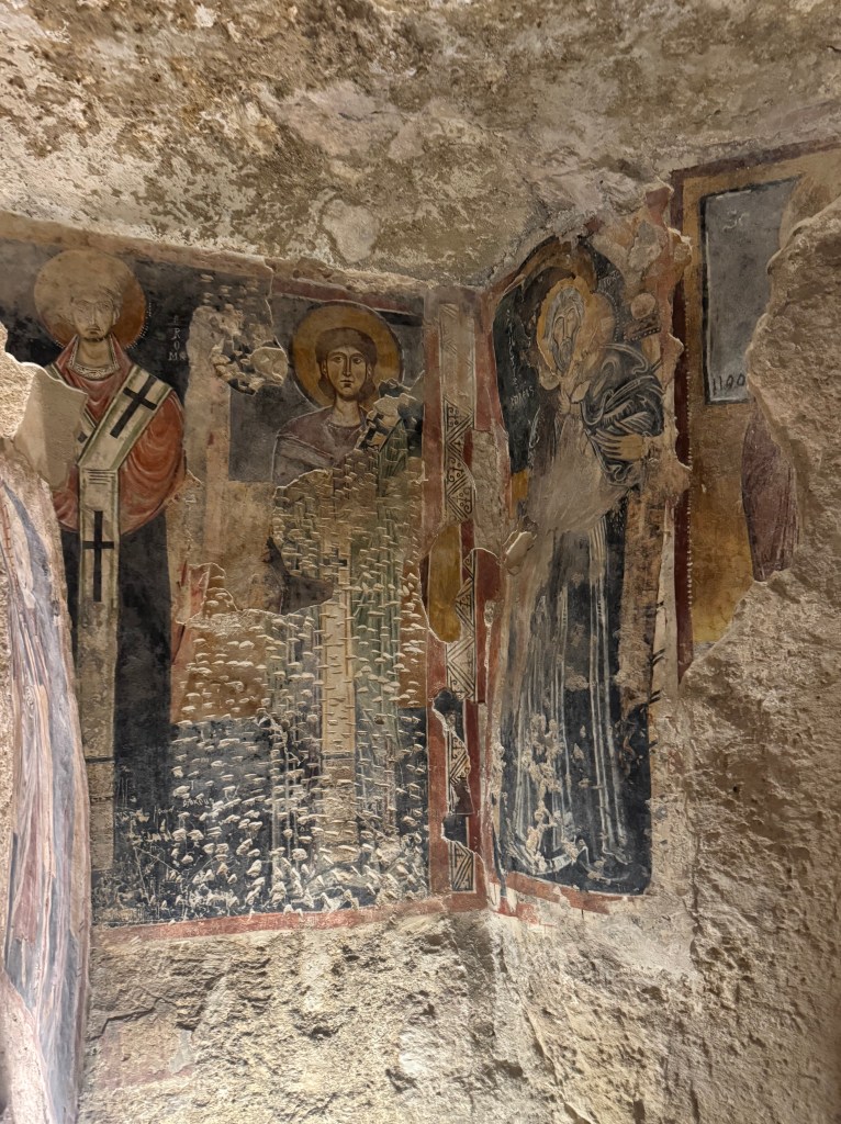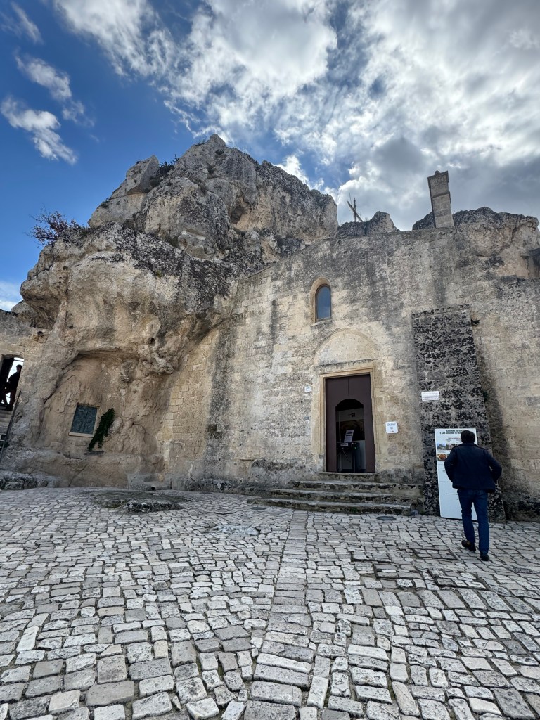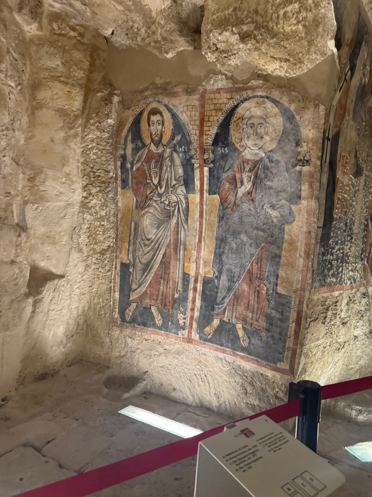 Santa Maria de Idris San Giovanni in Monterrone, is one of the Rupestrian Churches of Matera. I had to look up the word Rupestrian – and it refers to things made, found, or existing on or in rock, especially cave walls, often involving ancient rock art.