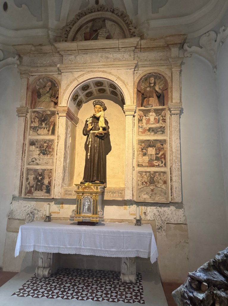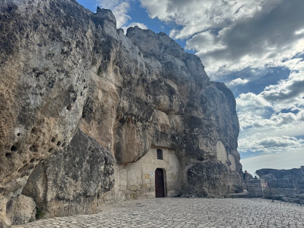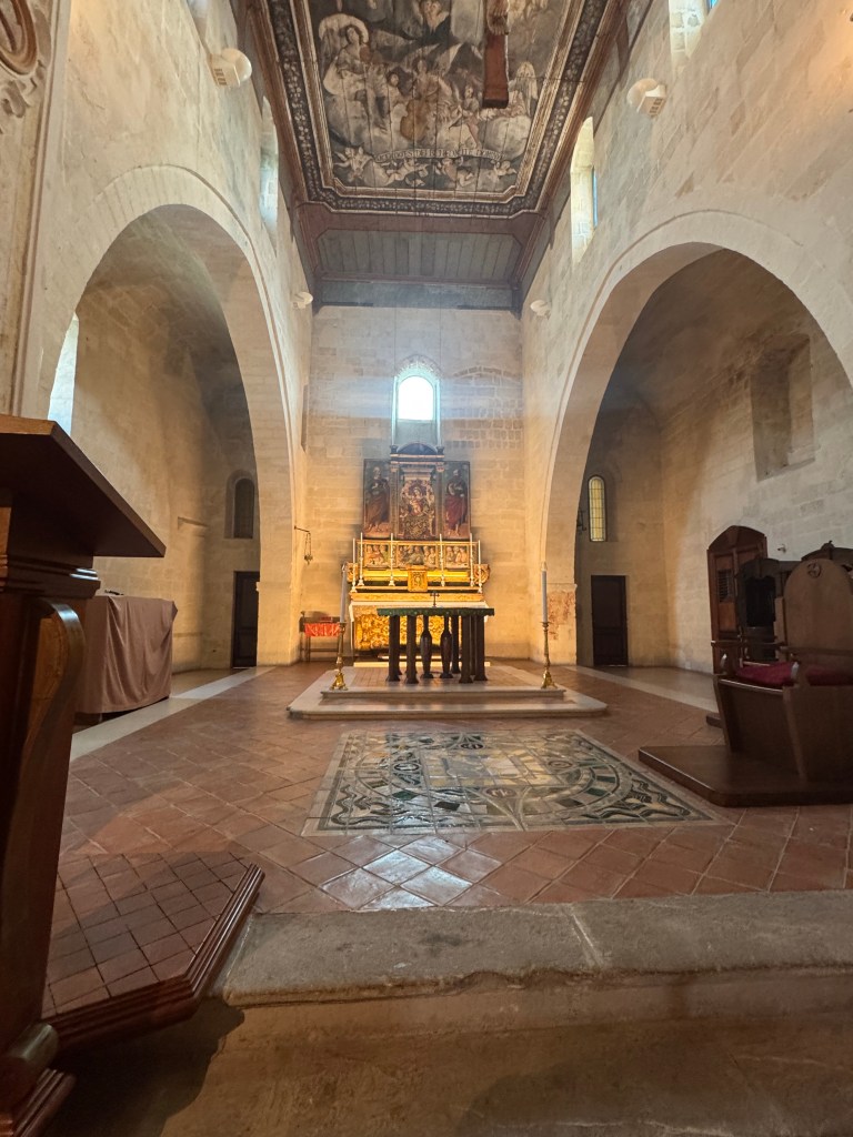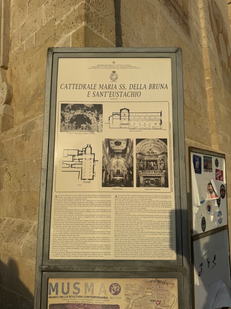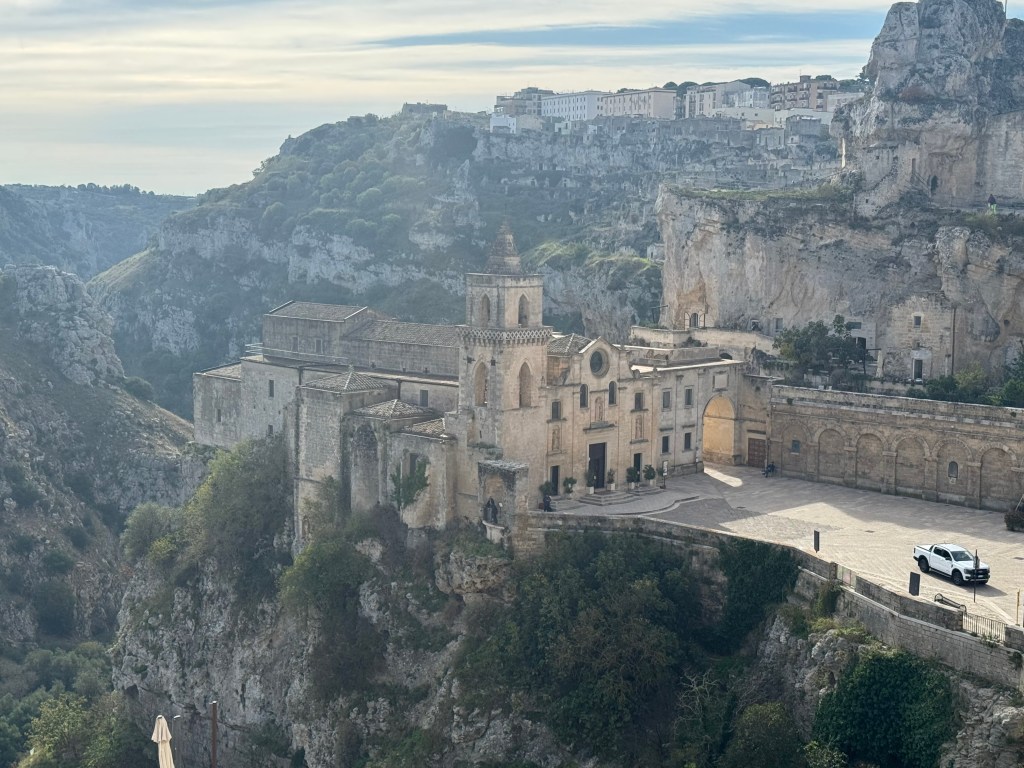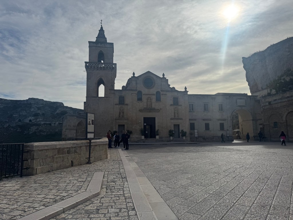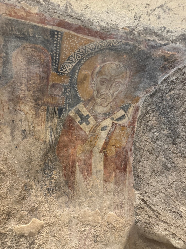 Santa Maria de Idris San Giovanni in Monterrone, is one of the Rupestrian Churches of Matera. I had to look up the word Rupestrian – and it refers to things made, found, or existing on or in rock, especially cave walls, often involving ancient rock art.