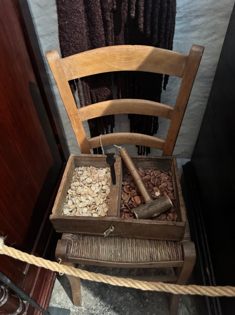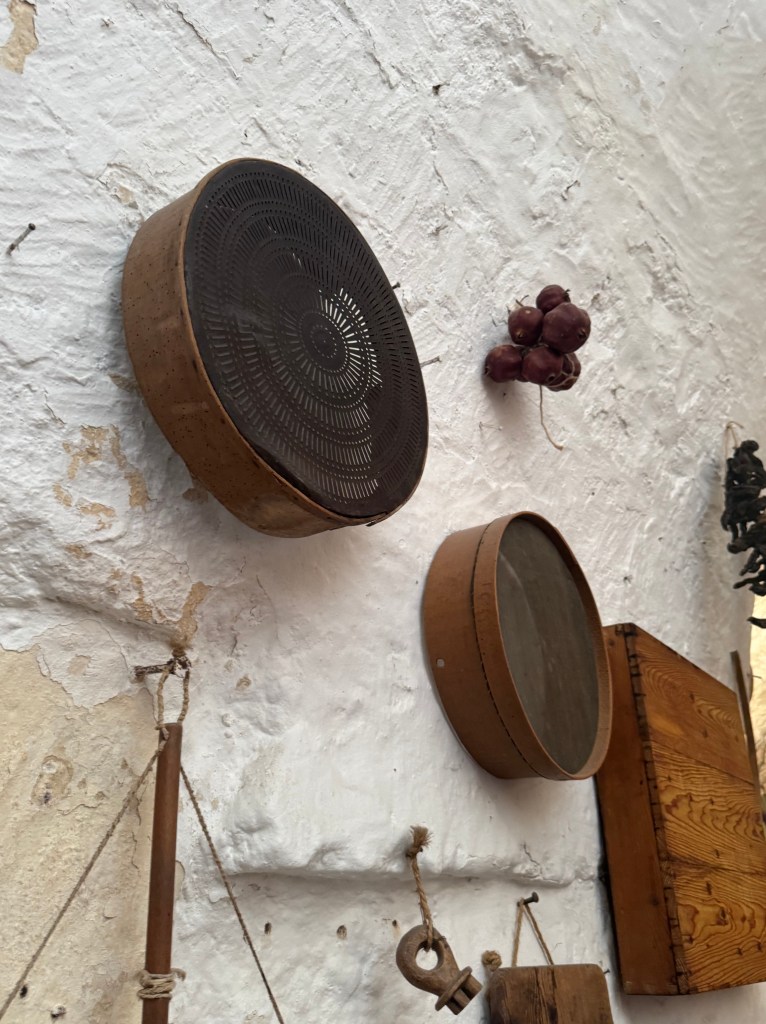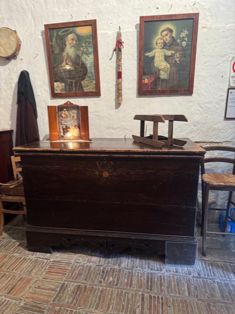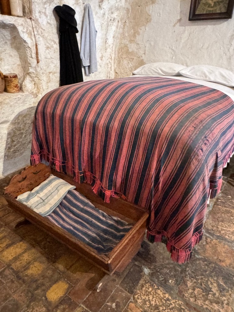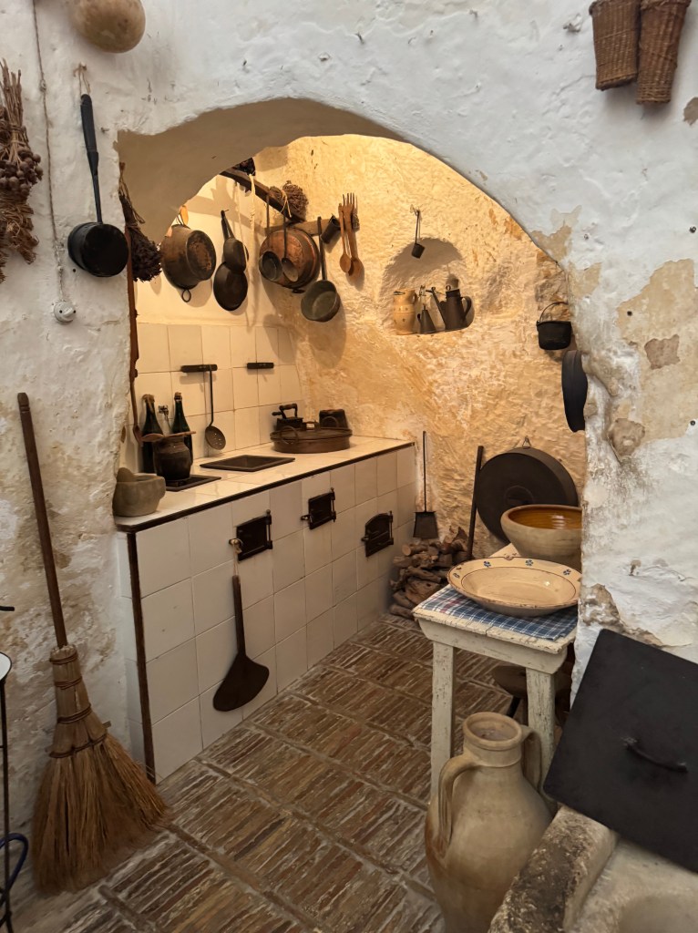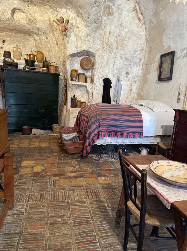 Wanting to get a good look at what Matera may have been like a few hundred years ago, before the conditions deteriorated, we visited the Casa Grotta di Vico Solatario, (Cave house of Solitary alley). It is a museum that depicts what real peasant sassi dwellings were like when in use. I didn’t get a good photo of the animal stalls, which were within the same structure as the people who lived there, some in back of the dwelling, and some within the same area.