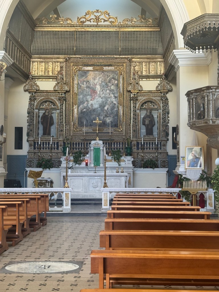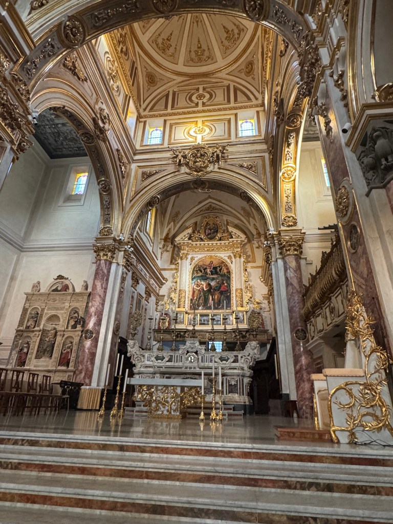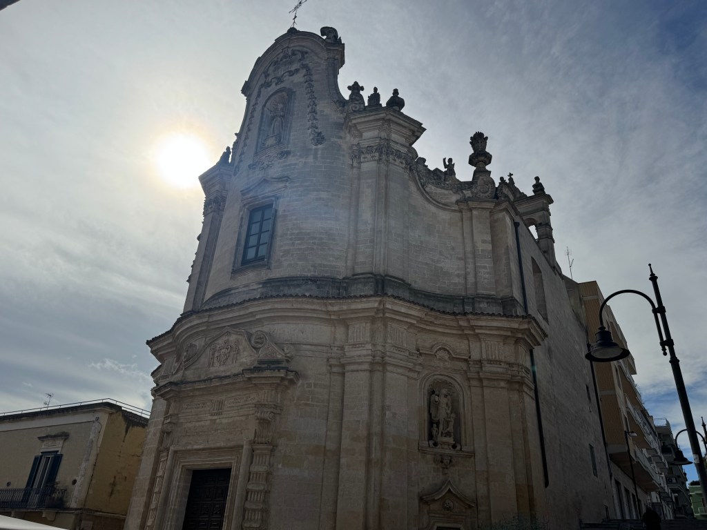There are some incredible churches in Matera. My personal favorite was San Pietro Caveoso, also known as “Saint Peter and Saint Paul Church”. The baroque style front of the church gives way to 3 doors, and over each, is a niche with statues; The Madonna of the mercy, Saint Peter, and Saint Paul. There is also a bell tower. The alter has something called a polyptych (Greek word for work of art, usually a panel painting) dating back to 1540, and painted by an anonymous artist from Matera. In one of the chapels is a baptismal font from the 13th century. There’s also an incredible view surrounding it on 3 sides: