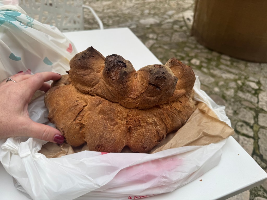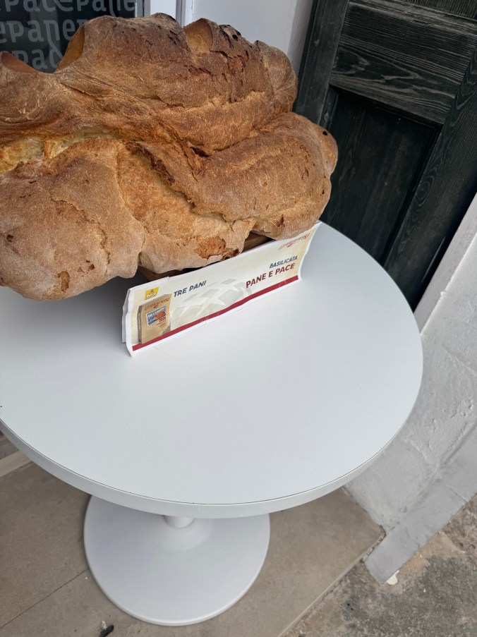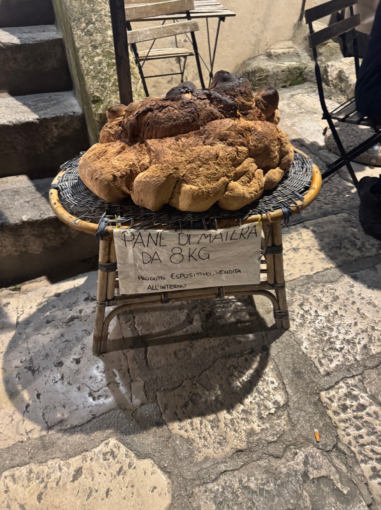 There’s a type of bread that Matera is known for, called Pane di Matera. It is an ancient bread that has been made here for thousands of years. Our hotel hostess, Alexandra, is the one who told us about it. She told us that everyone in the city, even outside of the old town, makes and eats this bread routinely. She told us that her family enjoys slicing it thin, right out of the oven, and eating it plain, without olive oil added. Upon doing a little research, I’ve learned that the amazing bread is based on a longstanding tradition. Many of the strains of wheat used to make the flour for it are unique to Italy and have been cultivated by local farmers for thousands of years. No other type of bread in this region is as highly regarded as the ancient Pane di Matera.