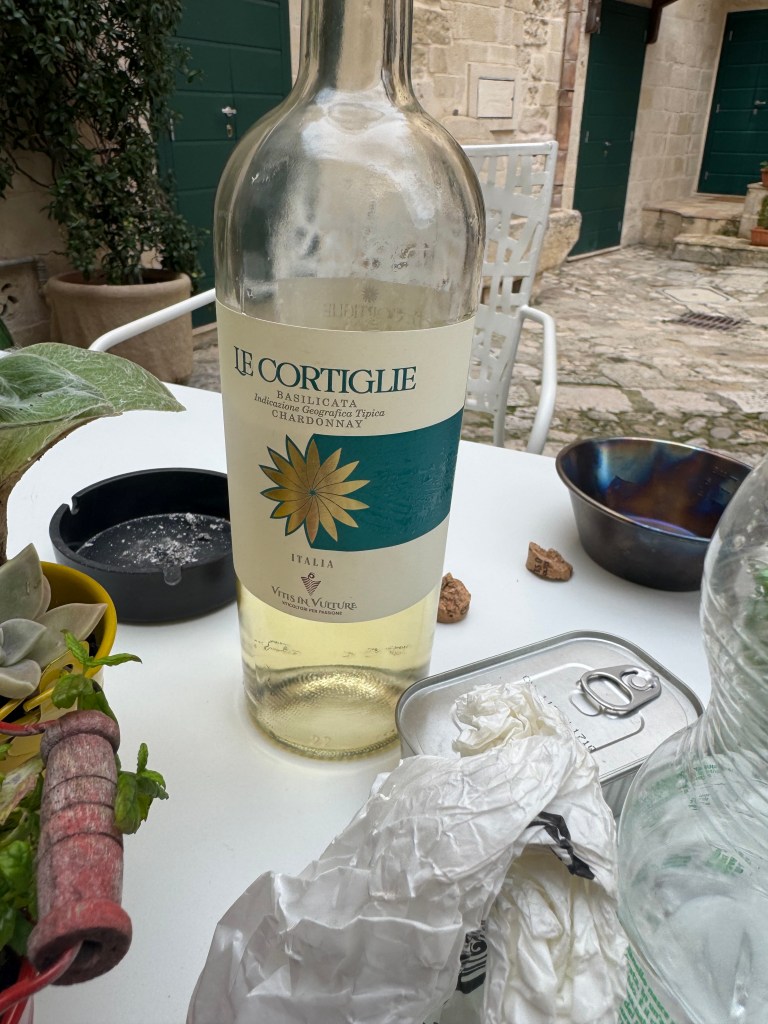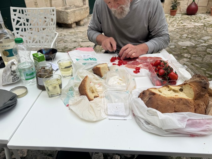 On the surface it may not seem like much, as it’s flour, water, yeast, and salt – basic ingredients that make up lots of other types of bread. This bread is entirely different from anything else we’ve had. It has a hard, dark brown crust on the outside, and a pale yellow inside. Alexandra told us that the rough conical shape is said to resemble the harsh nearby mountains. It has a flavor much like sourdough, but a little stronger and maybe a little sweeter. We decided to go to a bakery nearby and get a loaf to make into lunch. The photo above is from the display outside the bakery. We added a few things from the local market (buffalo mozzarella, tomatoes, olives, and white wine) – and got to fully enjoy and experience the pane di Matera! It was delicious and interesting due to it’s uniqueness.