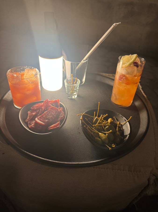 Have you ever had a caper berry? Maybe we’re just really late to the caper berry party – but nobody we’ve asked since we’ve been back has heard of them either. No, I’m not talking about capers. These are about the size of a green olive, and are on a stem. They’re pickled like capers, but they’re much larger. One of our favorite things we ate on this trip was those caper berries! On our last night in Matera, we set out to find a fun rooftop bar, and we happened in to the Zipa Cafe (www.zipacafe.com). They seated us on a cool rooftop on small beanbag type chairs, and a beanbag table, overlooking the valley below Matera. It was such a fun vibe, a beautiful view, and we loved it.
