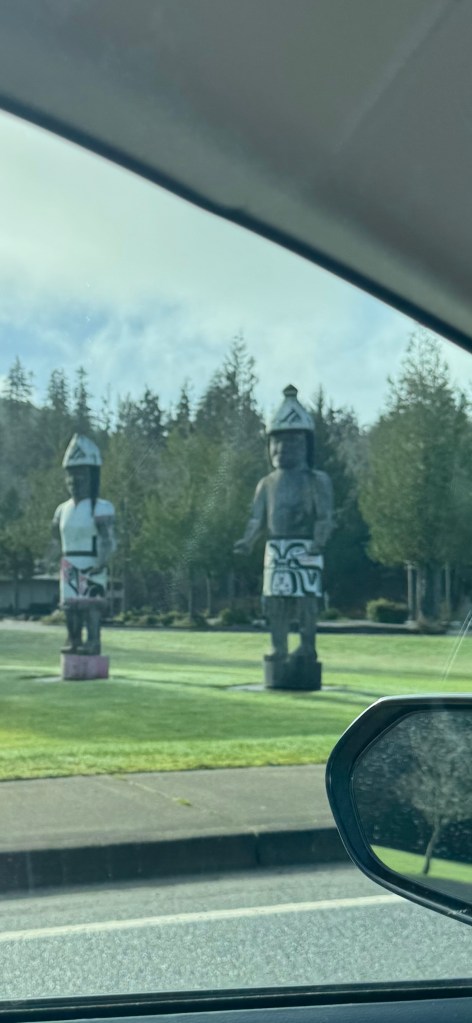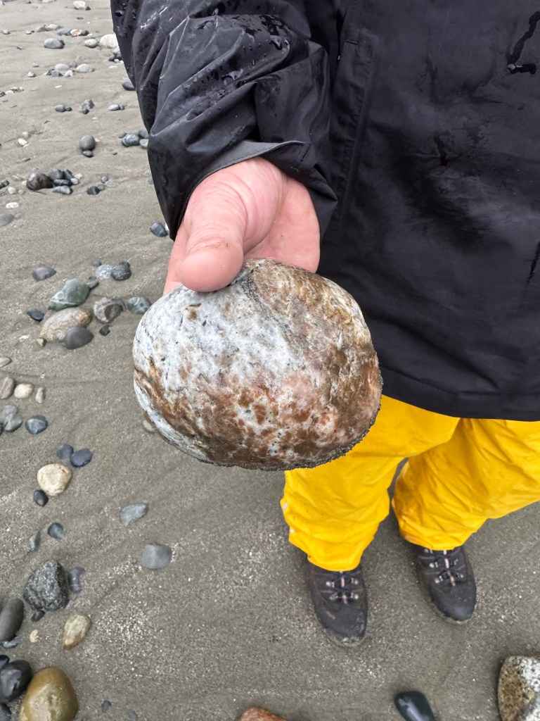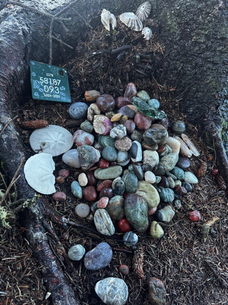 The next morning, we drove the 2 hours or so to the Shi Shi Beach trailhead. The photos above are of the stops along the way; one to look for rocks, and one to get lunch, coffee, and the Makah recreation permit in Neah Bay. The drive from Sequim, through Port Angeles, to Neah Bay, on a 2-lane road along the coast was absolutely beautiful! Important to note that that stretch of road runs along the “Whale Trail” complete with storyboards at many overlooks.