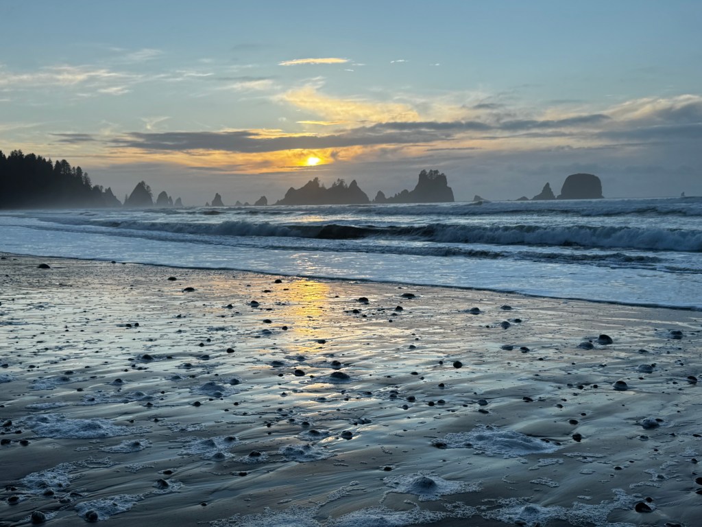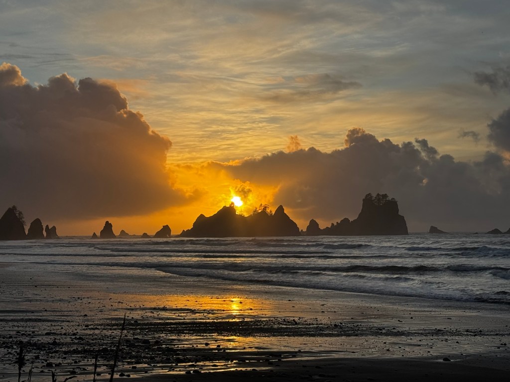 One of the things we both remembered as a highlight of our previous trip to Olympic, were the incredible sunsets we witnessed here. We hoped to get to see another one, even knowing what we did about potential rain and clouds. Our first night we got to see a good one! The view in the photos below, is a rugged, coastal landmark at the south end of ShiShi Beach known as Point of Arches.