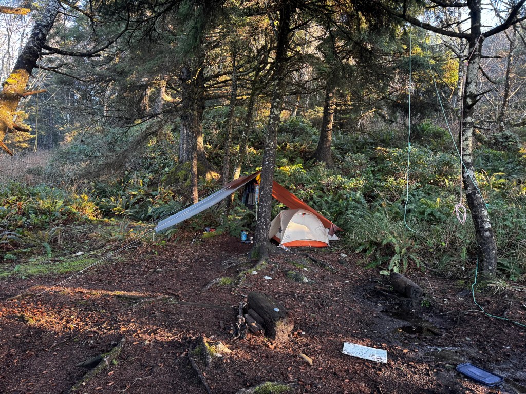 Shannon had worked hard to make sure we’d stay dry. As it was February, research had shown that we could be faced with some wet weather. Shannon brought 2 tarps to make a very particular configuration intended to keep us dry, and he was entirely successful at that. We set up camp on Sunday, and it began raining overnight Sunday night to Monday. It rained for a few hours on Monday morning, and we suited up in our rain gear and carried on.
